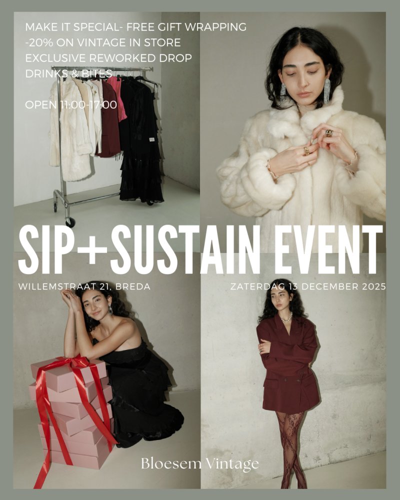 Op zaterdag 13 december organiseert Bloesem Vintage weer een editie van haar maandelijkse evenement SIP+SUSTAIN. Omdat het de laatste editie van het jaar is, pakken ze uit: Naast dat je weer shopt met 20% korting, geniet je tijdens het shoppen van een glaasje bubbels en verloten ze een kleuranalyse onder de shoppers. Uiteraard kun je die kleuranalyse ook cadeau geven aan iemand anders. Ze repareren de hele dag gratis je oude party items zodat je ze weer aan kunt tijdens de feestdagen. Denk; kapotte voeringen, ontbrekende knopen, inkorten, uitnemen, naden herstellen. Het enige dat ze niet kunnen repareren die dag zijn ritsen (want daarvoor hebben ze passend materiaal nodig).