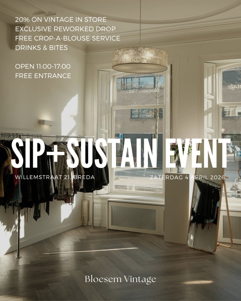Op zaterdag 4 april is de 8e editie van SIP + SUSTAIN bij Bloesem. Tijdens dit maandelijks terugkerende event combineert de vintagewinkel duurzaam shoppen met een gratis workshop of upcycling service. Daarnaast shop je de collectie met 20% korting.