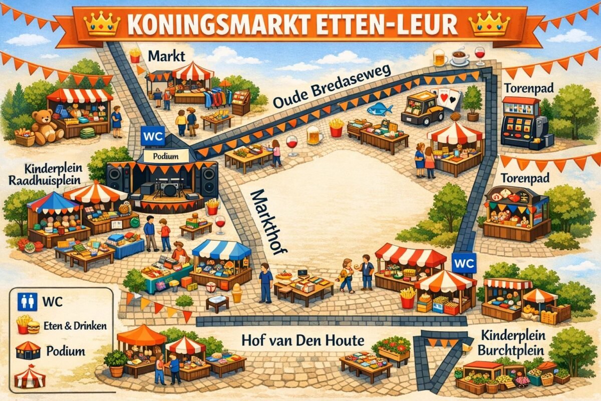 'Stichting Van alle markten thuis' houdt ook dit jaar weer de Koningsmarkt, op maandag 27 april van 8.00-17.00 uur. Een particuliere kleedjesmarkt in het centrum van Etten-Leur. Groter dan ooit, met zo'n 450 grondplaatsen!