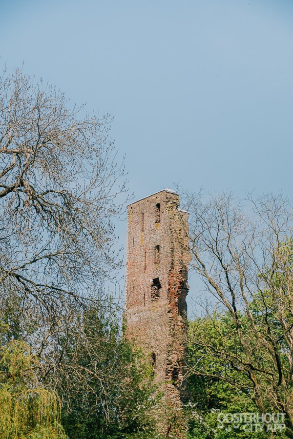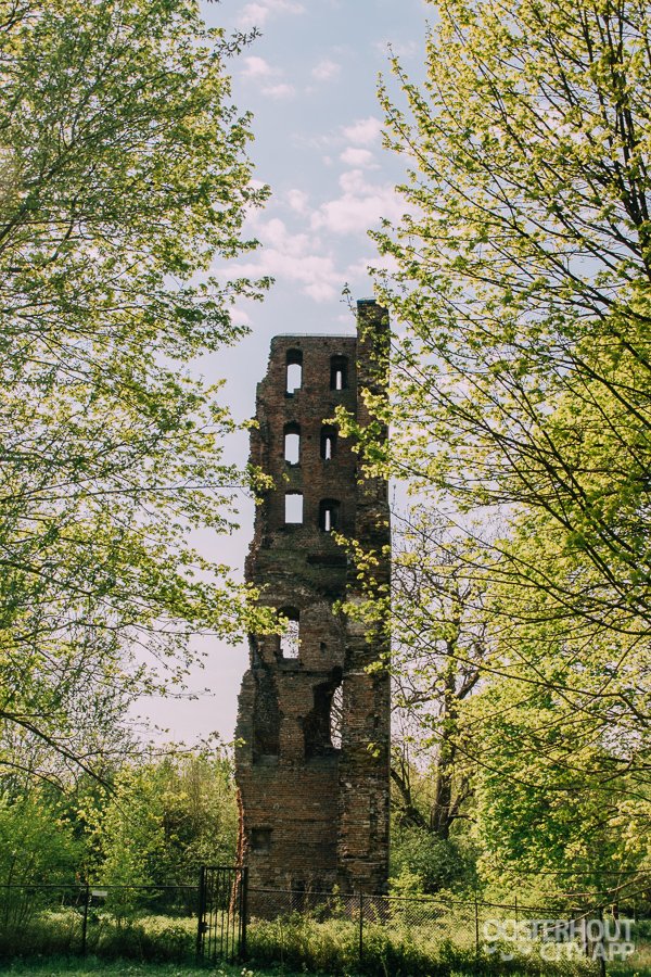 Een hoek van de 25m hoge toren staat nog overeind en is nu eigendom van de Rijksgebouwendienst.