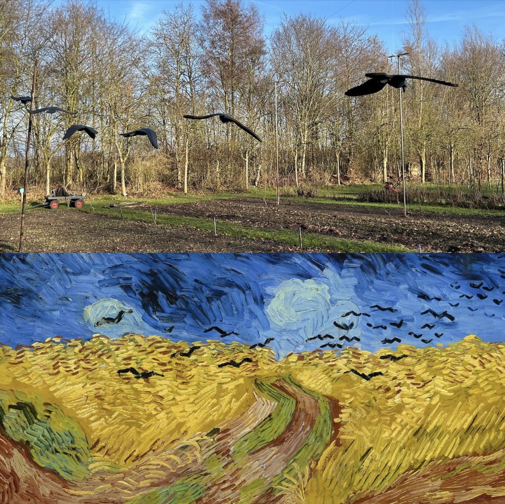 Eind vorig jaar zijn in de Beleeftuin - helemaal achteraan - stroken met verschillende wintergranen ingezaaid. Met een beetje geluk ontstaat zo richting zomer een korenveld. En ook bij een korenveld dachten wij natuurlijk aan Van Gogh. 'Korenveld met kraaien' is één van de beroemdste schilderijen van Van Gogh. Het was ook een van de laatste werken van de kunstenaar, geschilderd in juli 1890.