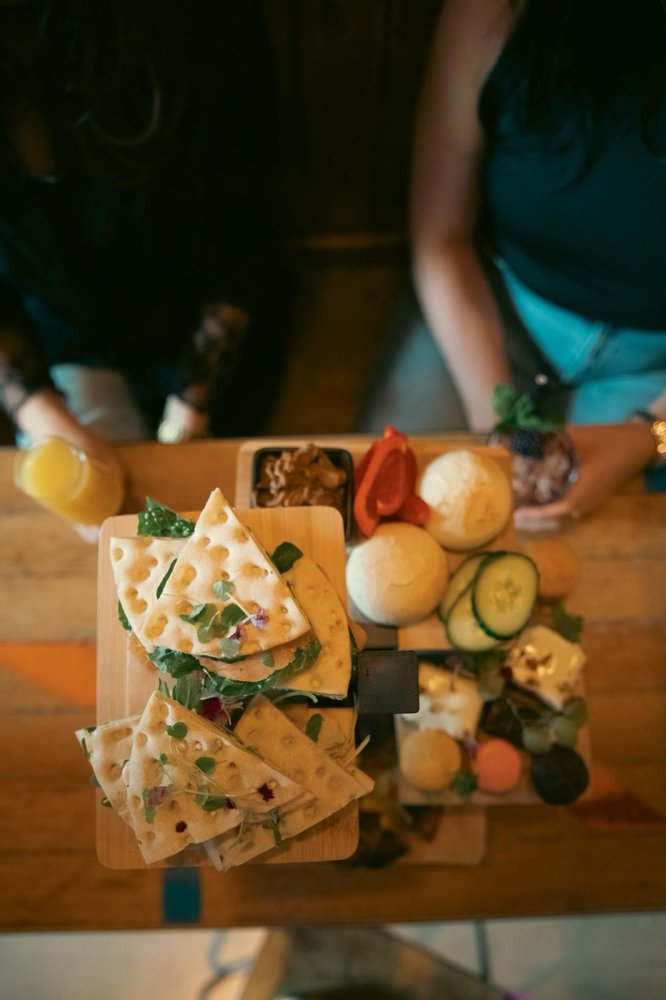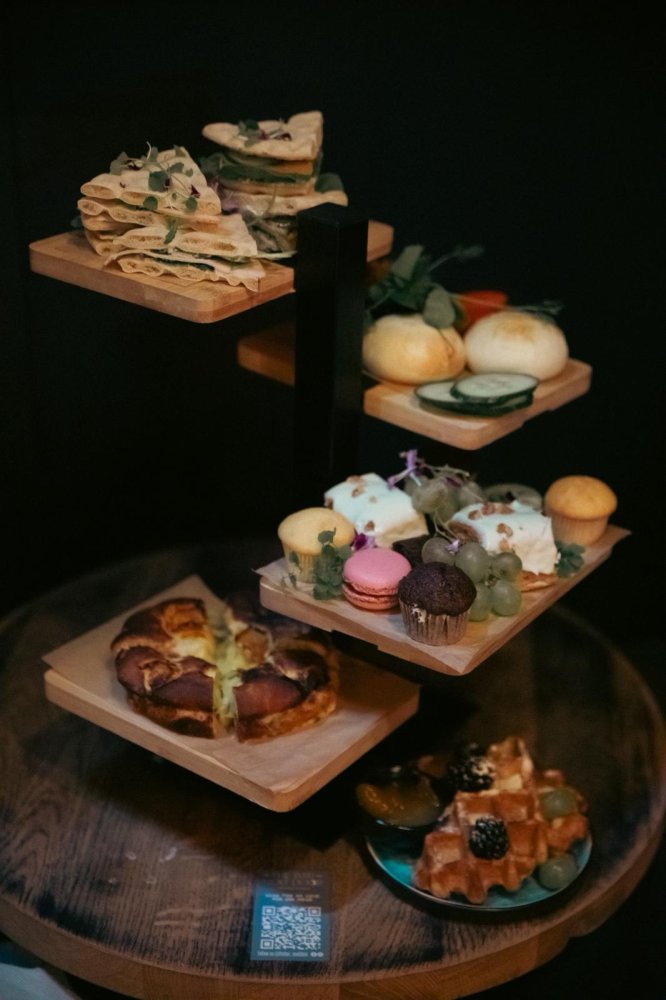 Het foodmenu biedt een zorgvuldig samengestelde selectie van zoete en hartige bites, waaronder bao buns met jackfruit rendang, mini sandwiches met zalm & truffelkip, focaccia met vier kazen en een zoete afsluiter van brownies, macarons en carrot cake.
