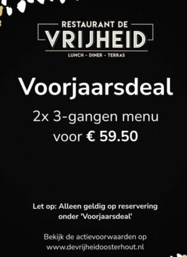 Voorjaarsdeal 25 februari - 31 mei Restaurant De Vrijheid Meer genieten. Minder betalen. Lees verder Meer genieten. Minder betalen.Onze voorjaarsdeal start 25 februari:🍴 3 gangen • 2 personen • €59,50Ideaal voor een gezellige avond uit.Nu reserveren = verzekerd van een tafel Heuvel 11, 4901KB oosterhout