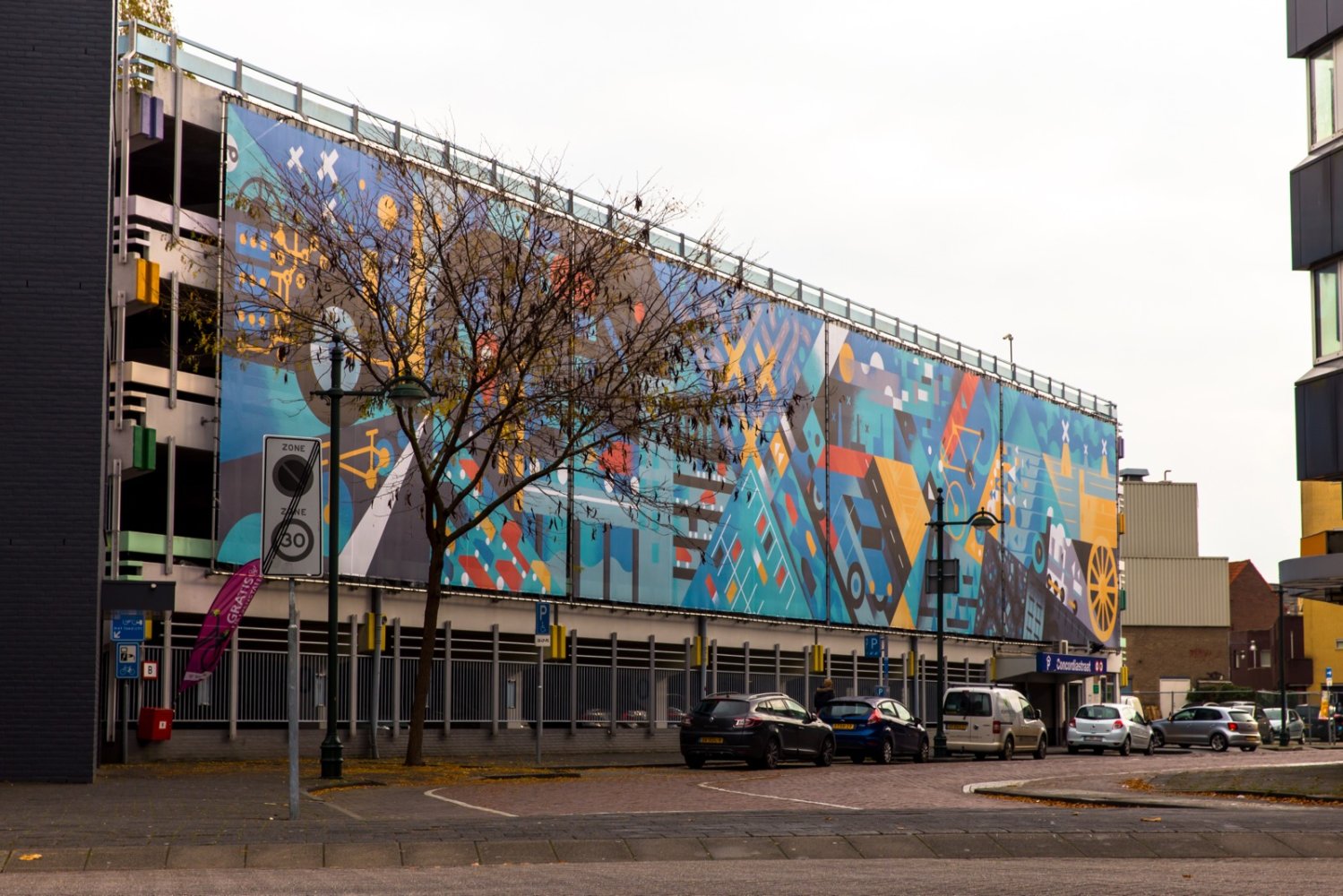 Aan de gevel op het oudste parkeergarage in het centrum (1968) hangt een print gemaakt door illustrator en graficus Aron Vellekoop León. Zijn thema mobiliteit past goed bij de functie van de garage. Als ware ambachtsman in het digitale tijdperk moest Aron voor deze opdracht toch echt werken met een computer. De print is tot stand gekomen in samenwerking met het parkeerbedrijf van de Gemeente Breda. Lees verder