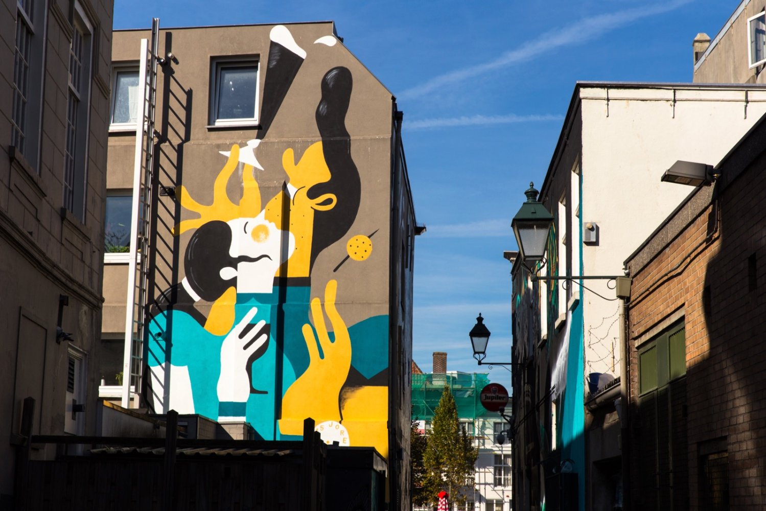 Dit werk werd speciaal gemaakt om de Potkanstraat visueel te verbeteren (zoals 4, 5 & 7). Qua kleur verwijst de schildering naar water van de haven. Het feestende duo, met een drankje en bitterbal in de hand, brengt een ode aan het Bredase uitgaans­leven. Lees verder