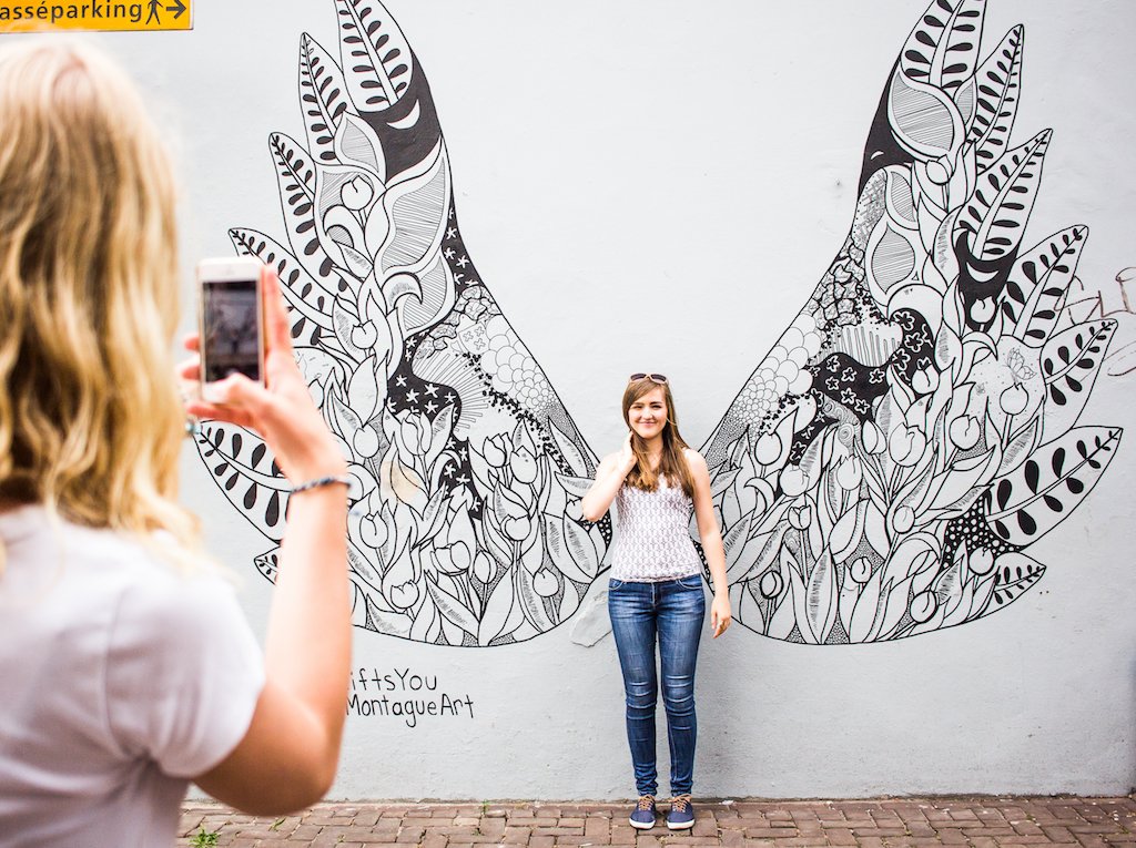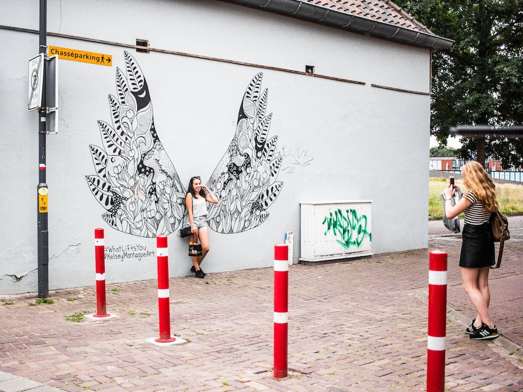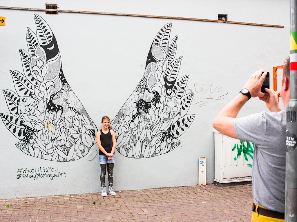 Kelsey Montague (USA) startte 3 jaar geleden met haar #WhatLiftsYou project. Inmiddels zijn haar grote engelen vleugels te zien in diverse steden in Noord/Centraal Amerika, Australië en Europa. Het werk nodigt mensen uit voor de vleugels te gaan staan en hun inspiratie te delen via social media met de #WhatLiftsYou.