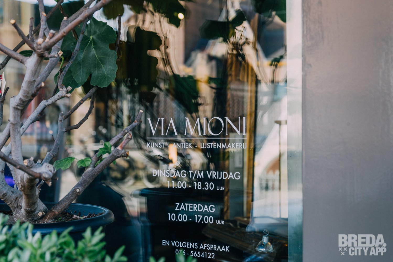 VIA MIONI is een ruime winkel met een zeer gevarieerd aanbod. Een uitgebreide collectie kunst van circa 1850 tot heden. Schilderijen, tekeningen, grafiek en bronzen beelden. In de lijstenmakerij heb je keuze uit ruim 1600 lijstmonsters: modern, antiek, klassiek en een grote sortering handgekleurde Italiaanse lijsten. VIA MIONI is officieel dealer van Stas Kunstophangsystemen. De antiek-collectie omvat meubelen en kleingoed uit de achttiende en negentiende eeuw. Tevens beschikt VIA MIONI over de gehele collectie Giso verlichting repro art-déco in nikkel, chroom en messing. Vanaf april is de stadstuingeopend met vele decoratieve objecten.