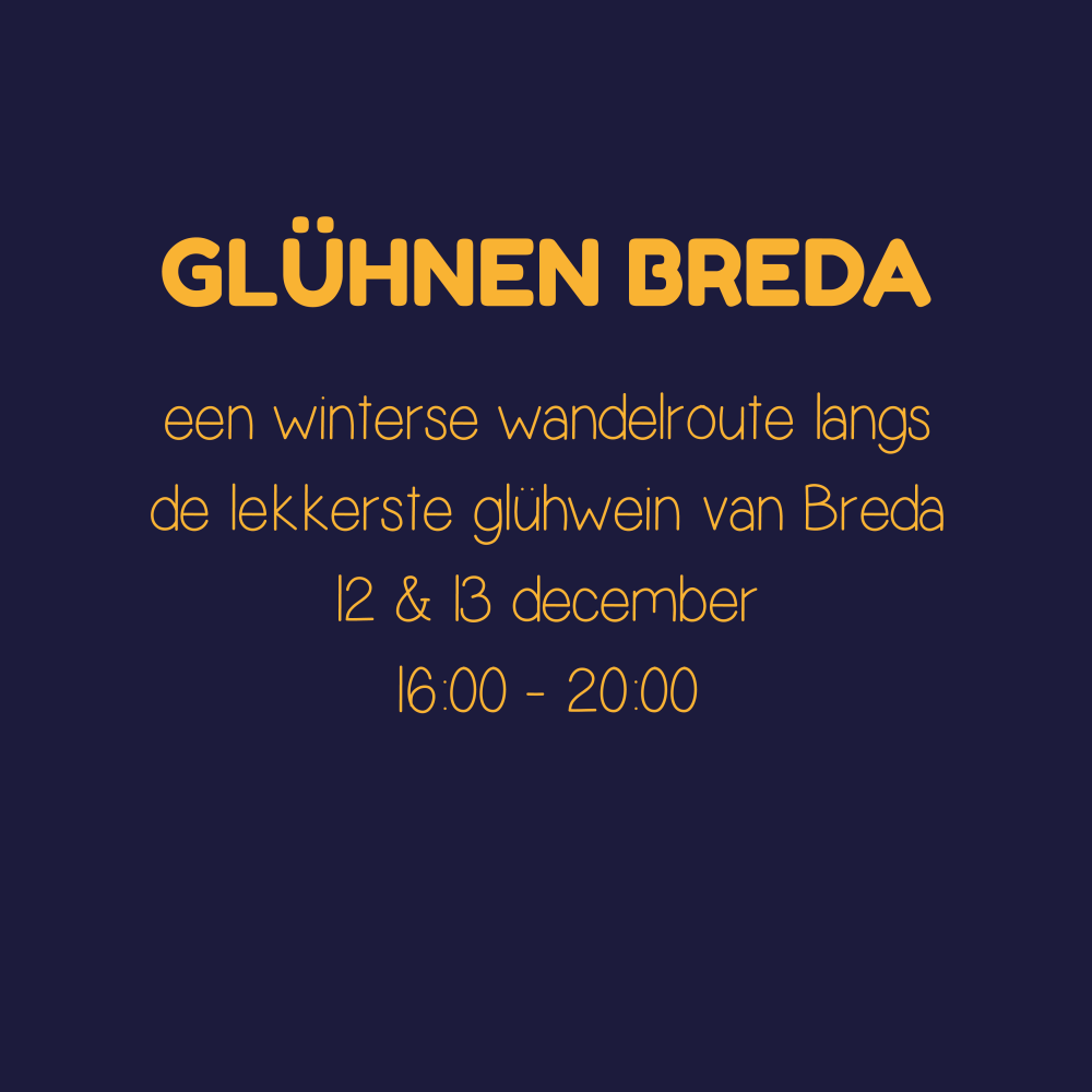 Op 12 en 13 december, tussen 16.00 en 20.00 kan Breda gaan Glühnen: een wandelroute langs verschillende horecagelegenheden in het centrum en de Belcrum waar ze een glühwein of andere versnapering kunnen oppikken.