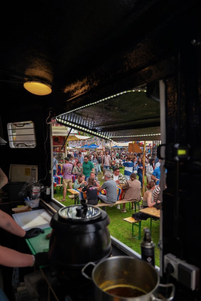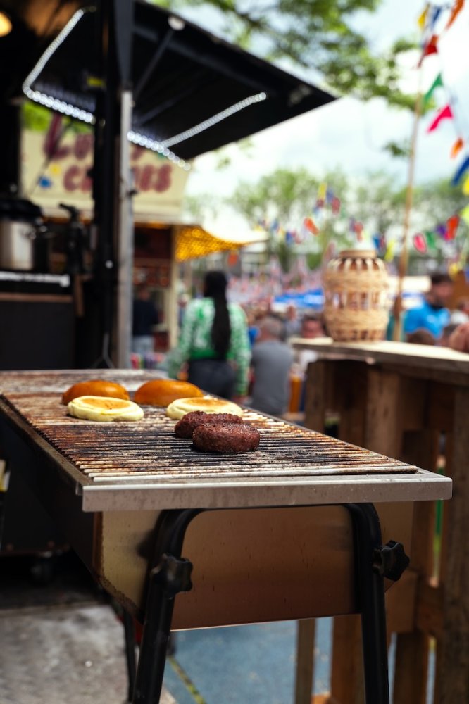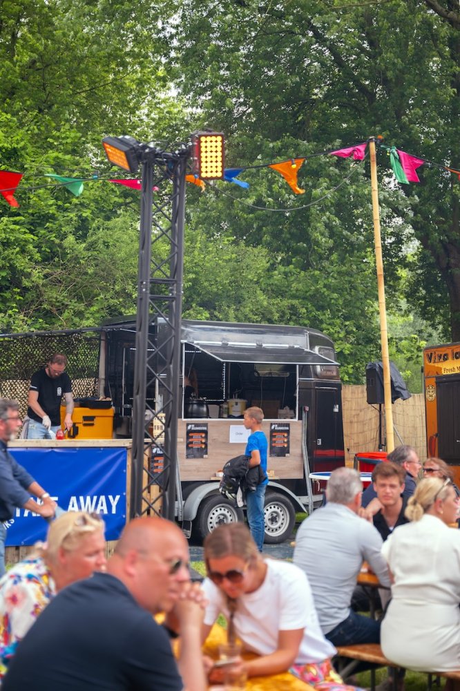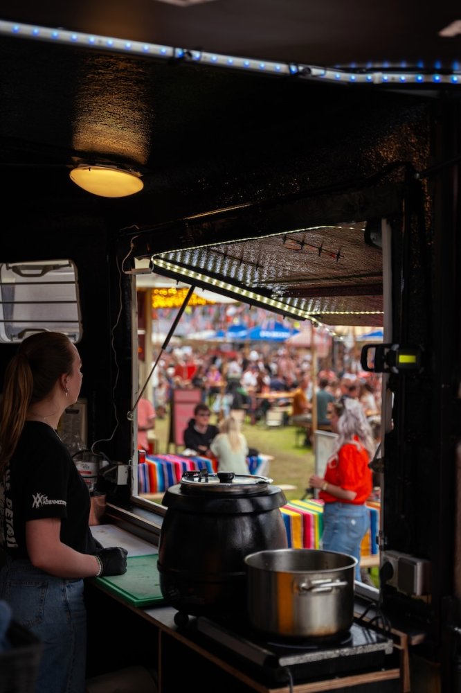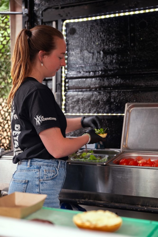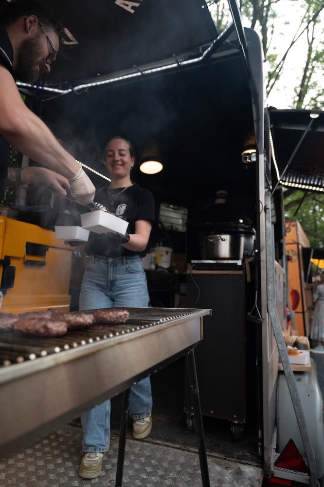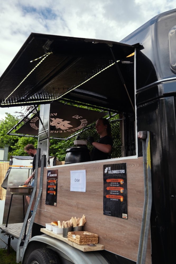 Eerder hadden zij al eens een omgebouwde paardentrailer geleend voor een cateringklus, en dat beviel uitstekend. Dit bracht hen op het idee om op zoek te gaan naar een eigen paardentrailer. Zo kwamen ze deze parel tegen – het was bijna liefde op het eerste gezicht. Ze hebben de trailer volledig gestript en opnieuw ingericht, zodat hij perfect aansluit op hun manier van werken. Aan beide zijkanten zijn luiken aangebracht die omhoog kunnen. In de punt van de wagen is een frituur geplaatst met daarboven een afzuigkap. Ook zijn er twee verrijdbare kasten toegevoegd, die zowel binnen als buiten gebruikt kunnen worden. De achterklep is voorzien van twee poten, waardoor deze gelijkvloers komt met de wagen – ideaal voor het plaatsen van de BBQ. Dit zorgt voor gemak en flexibiliteit bij elke cateringklus. Boven de BBQ hangt een banner die beschutting biedt tegen de regen.