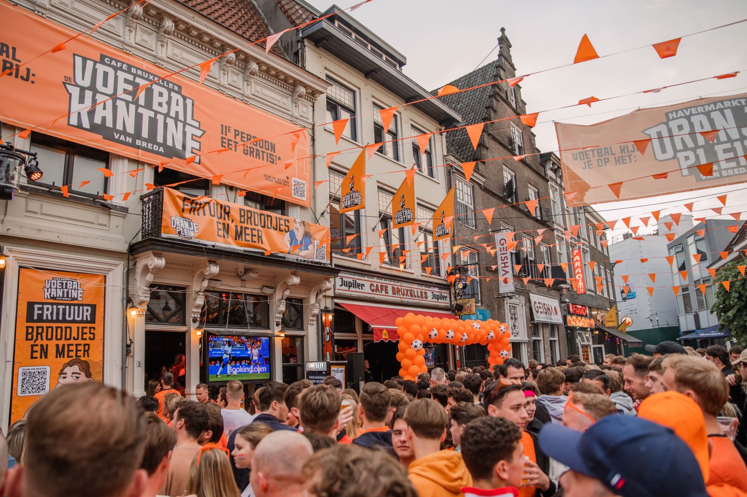 De Havermarkt is tijdens het EK dé plek om elke wedstrijd te volgen. De Havermarkt is veranderd in 'Oranjeplein'! Op het plein staan elf grote tv-schermen waarop je de wedstrijd kunt volgen. Daarnaast is er livemuziek en zijn er verschillende barren. Café Bruxelles wordt omgetoverd tot een ware voetbalkantine, compleet met een grasmat voor de deur, een snackplek en de medewerkers in voetbaloutfits. Tijdens deze spannende wedstrijden bestel jij jouw favoriete snacks makkelijk uit de kantine via een QR-code. Bestel een tosti, "loaded Dumfries" of ga voor "de Johan Cruijff Schaal"! Je hoeft niet te wachten, je ontvangt een SMS bericht als jouw bestelling klaarstaat!