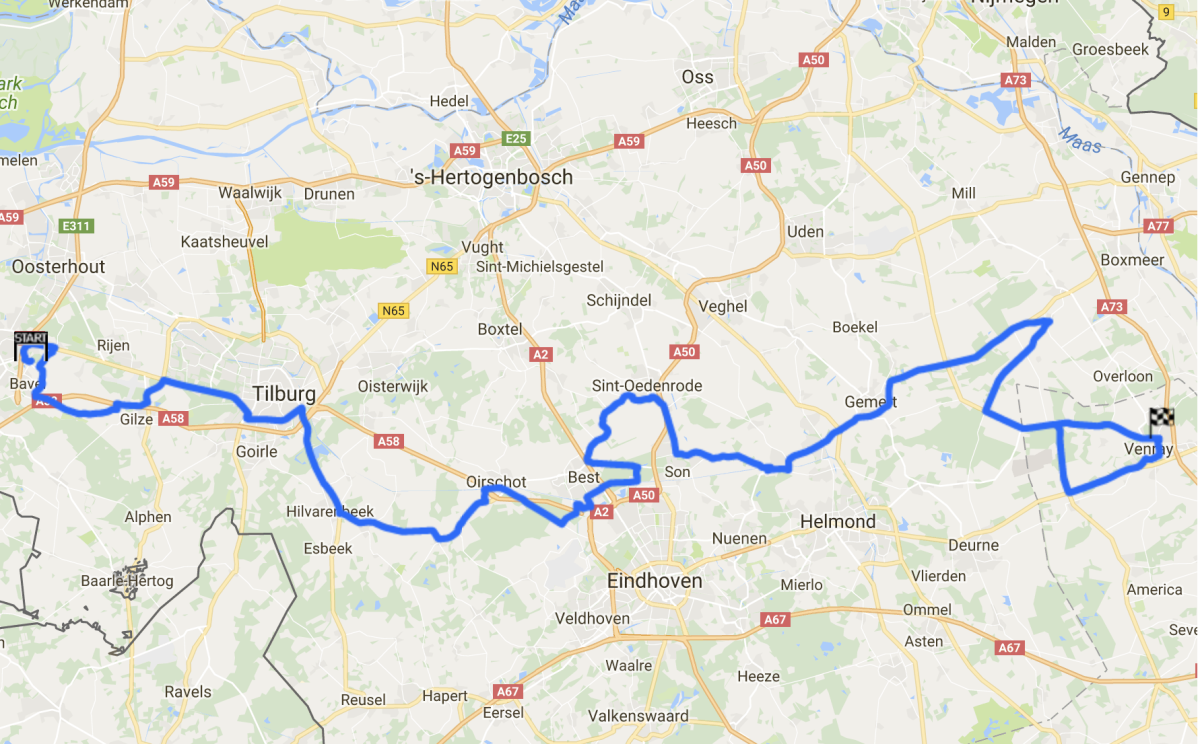 De eerste etappe, van 200 kilometer, start op maandag 7 augustus en bestaat uit een vlakke exercitie tussen Breda en Venray. Om 12.20 uur start de eerste etappe vanaf Breepark en vertrekken de wielrenners via de Tilburgseweg richting Dorst. Ze fietsen vervolgens door de Bavelstraat, Dortseweg, Wouwerbroekseweg, Tervoortseweg, Bolbergseweg en de Eikbergseweg.