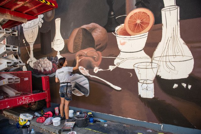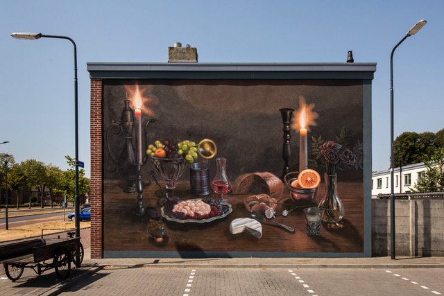 Een stevige maaltijd Het duo Colectivo Licuado, bestaande uit Camilo Núñez en Florencia Durán, uit Uruguay schilderden een opvallend stilleven aan de Vestkant. Het verhaal achter de schildering haalde Blind Walls Gallery uit oude stadsrekeningen waarvan afgeleid kan worden dat 16e eeuwse Bredanaars wel hielden van een stevige maaltijd. Zo organiseerde het stadsbestuur in 1544 een Pinkstermaaltijd in het Stadhuis, voor kerkmeesters en geestelijken van de Grote Kerk. Er werd een groot assortiment van gebraden vlees opgediend, de tweede gang bestond uit Teteringse kazen, een specialiteit in die tijd. Verder hadden de gasten keuze uit ruim 77 kannen wijn, waaronder rijnwijn, bourgogne en Spaanse wijn.