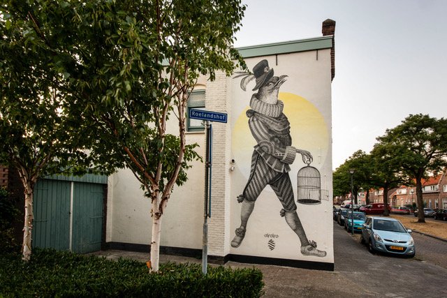 Het werk van AlfAlfA is te vinden op Dijklaan 73, bij het Roelandshof, de schildering van Colectivo Licuado op de kopgevel van het pand aan Vestkant 12.