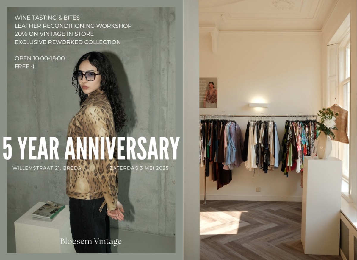 Vintagewinkel Bloesem Vintage bestaat vijf jaar en viert dat op zaterdag 3 mei met een evenement in hun winkel aan de Willemstraat. Bezoekers zijn tussen 10:00u en 18:00u welkom om het jubileum mee te vieren met een programma vol activiteiten: een workshop leer reconditioneren, de lancering van een speciale reworked collectie, 20% korting op de vintage collectie, hapjes & een wijnproeverij.