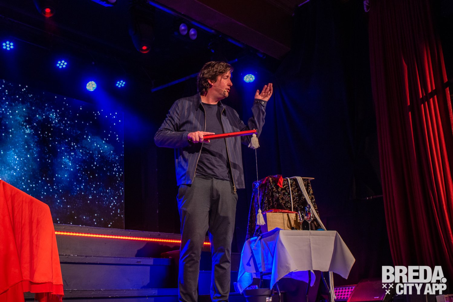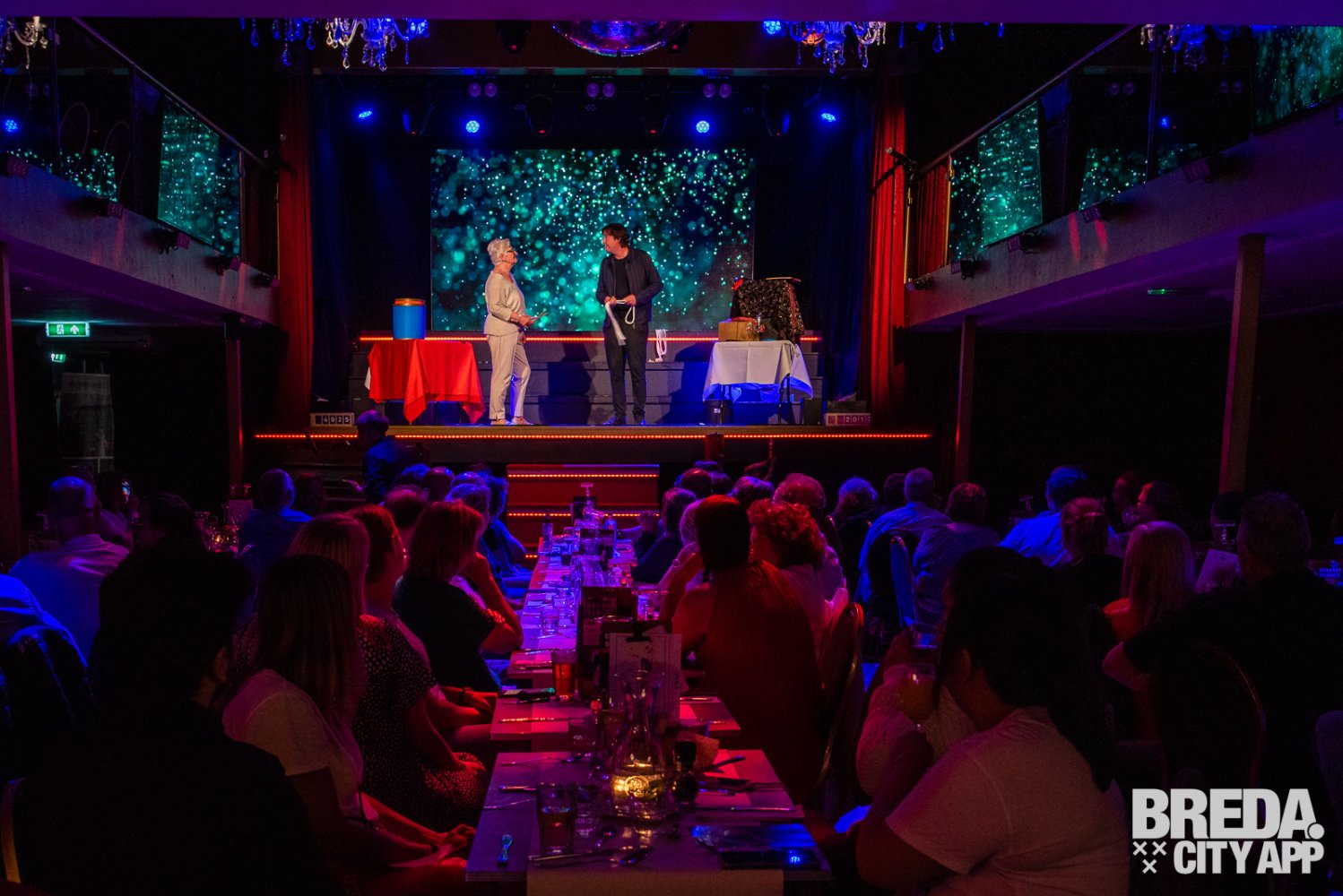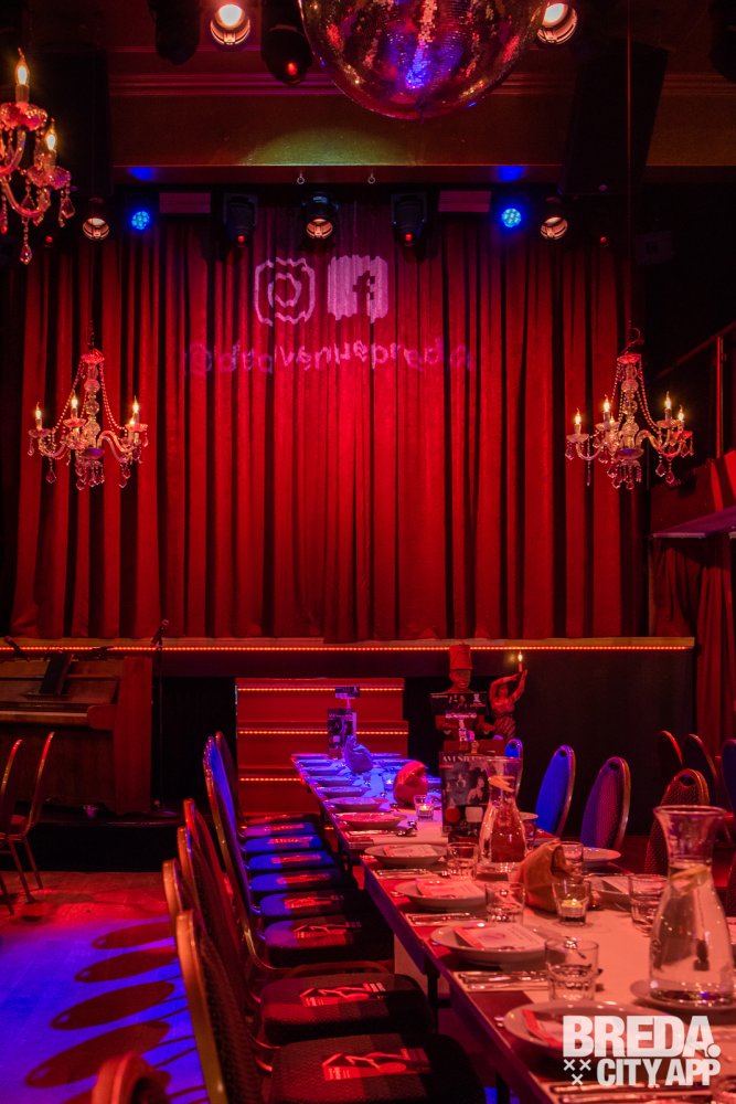Midden in het centrum van Breda vind je al ruim 25 jaar De Avenue, een voormalige schuilkerk die volledig is omgetoverd tot een prachtige allround evenementenlocatie. Rond 19:30 nemen we plaats in de sfeervolle Theaterzaal. De Theaterzaal heeft een karakteristieke uitstraling met kenmerken van het oorspronkelijke pand. Met een capaciteit tot 500 gasten is deze zaal een prachtige locatie voor vele feesten en zo ook de dinnershow van vanavond.