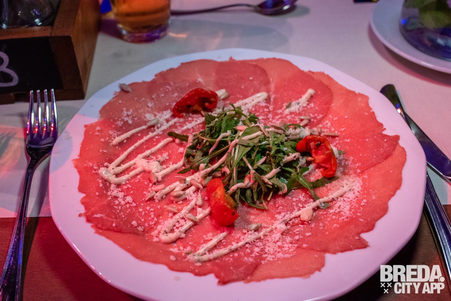 Dan volgen de voorgerechten: zowel de rundercarpaccio als de scampi-cocktail smaken goed. De rundercarpaccio wordt geserveerd met zonnebloempitjes, truffelmayonaise, rucola sla en zongedroogde tomaatjes.
