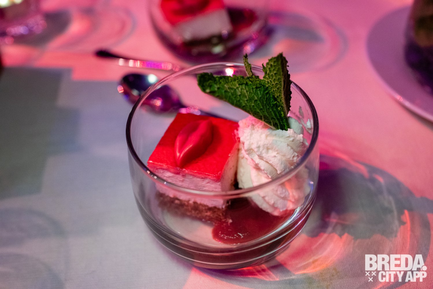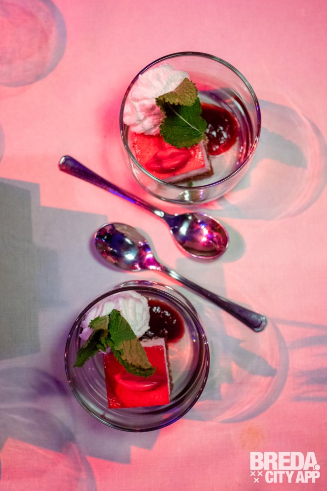 Het dessert wordt erg feestelijk uitgedeeld: via het podium en met veel vuurwerk wordt de kersenbavarois met vruchtencoulis en een toefje slagroom verspreid door de zaal via het enthousiaste personeel!