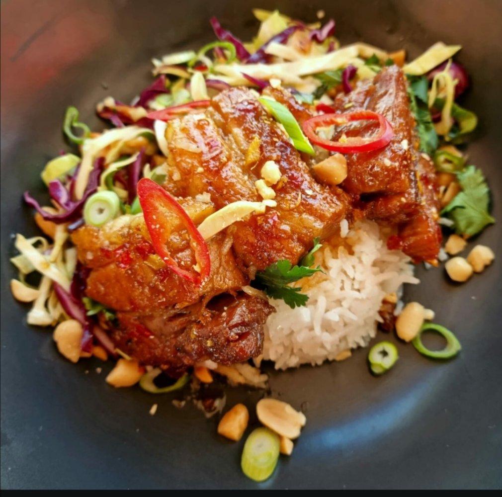 Het T-Huis is dé plek om even te ontsnappen aan de drukte van de stad, zonder daarbij het centrum te hoeven verlaten. Het T-Huis heeft een Aziatisch gerecht met buikspek, geserveerd met kokosrijst, rode koolsalade en een dressing van soja en gember.
