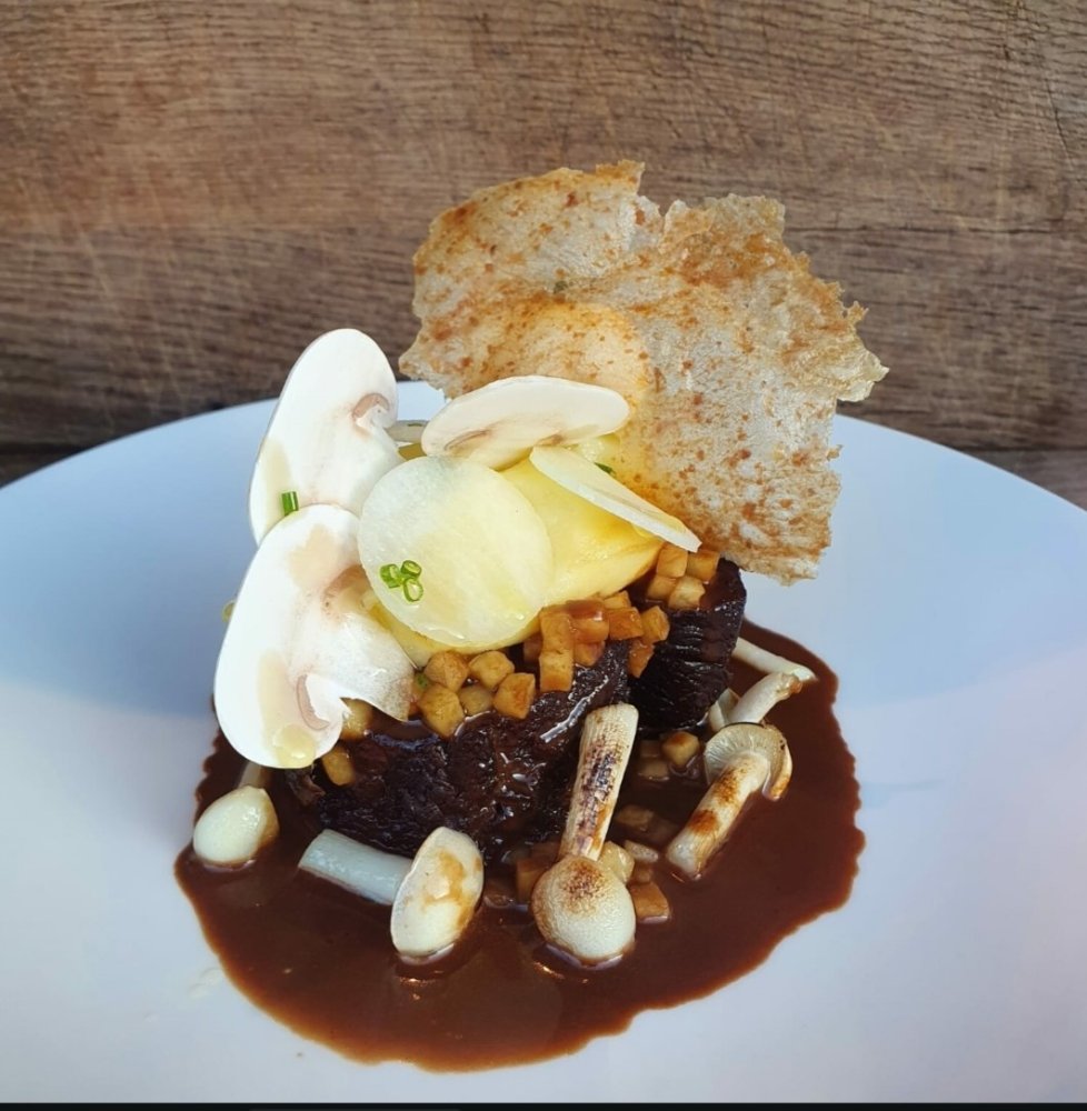 De eigenaren van Dok 19 Breda & Dok 18 Breda hebben onlangs de Kleine Wereld overgenomen en toveren dit om tot een nieuw concept! Bij DKW maken ze voor jou een gelakte rundersukade, met crème & krokant van aardappel, akkerzwam, koolrabi en jus van tijm.