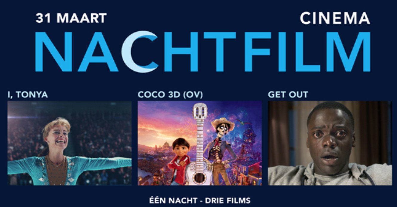 Deze maand kan je samen met Chassé Cinema duiken in de nachtfilm op zaterdag 31 maart. Je kan de thriller Get Out (4 nominaties waarvan 1 verzilverd) bekijken, het (waargebeurde) aandoenlijke portret van Tonya Harding in I, Tonya (3 nominaties waarvan 1 verzilverd) én de Beste animatiefilm volgens The Academy in 2018: Coco (1 nominatie/gewonnen Oscar).