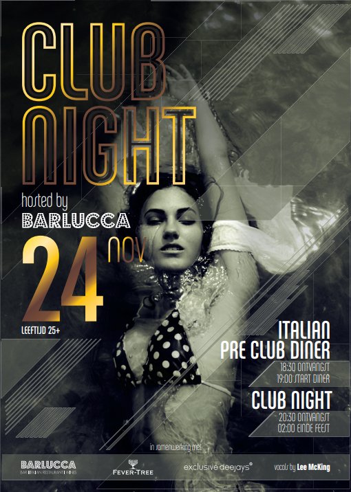 Extra deze editie heeft Barlucca op haar 2e verdieping een exclusive club diner voorafgaand aan de ClubNight. Om 18.30 uur worden gasten hier ontvangen met een aperitief, waarna om 19.00 uur gestart wordt met een 4-gangen Italian Diner. Dit diner wordt geserveerd met passende wijnen en tafelwater. LeeMcKing zorgt met haar prachtige stem voor fijne klanken tijdens het diner en warmt het publiek op voor de clubnight. Voor het diner zijn een beperkt aantal plaatsen beschikbaar, dus wees er snel bij.