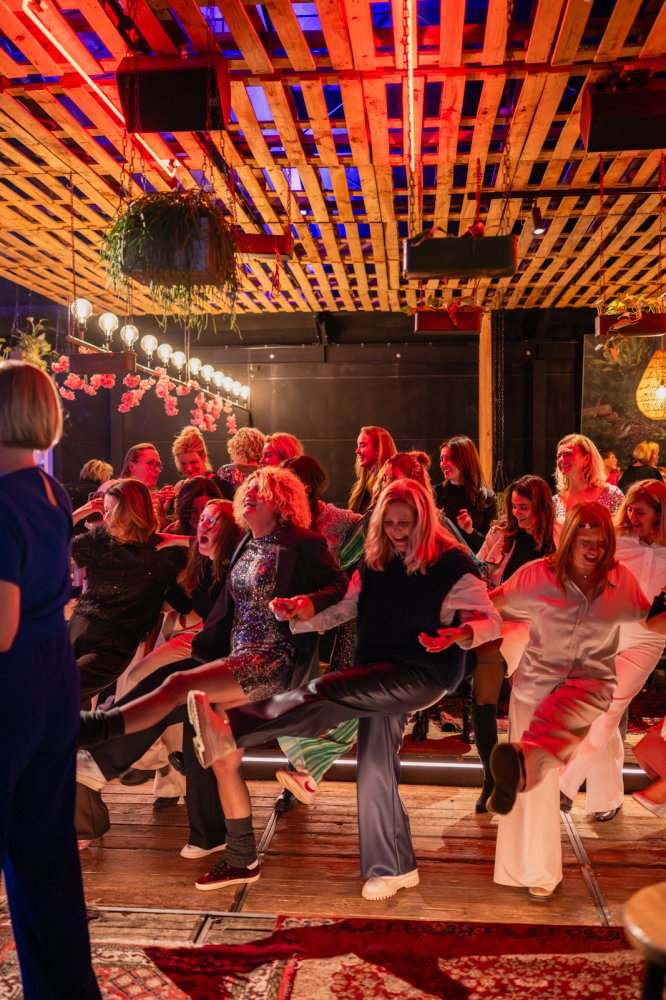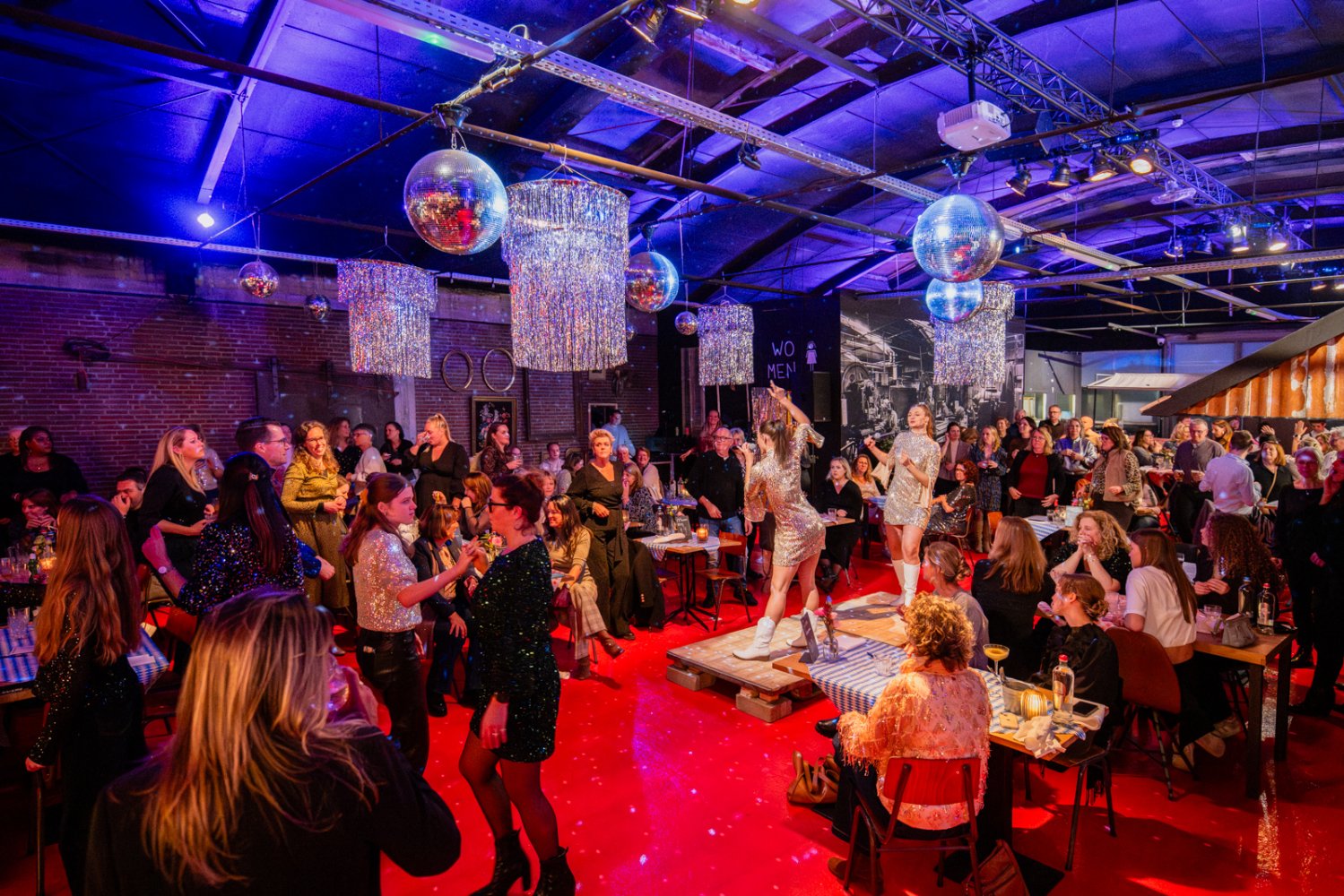 Wie De Houthallen binnenstapt, weet direct dat dit geen doorsnee avond uit wordt. De reis begint al op het afgelegen Galvanitas fabrieksterrein, waar bezoekers een Las Vegas-achtig lichtbord volgen dat hen de weg wijst naar de hal. Eenmaal binnen opent zich een getransformeerde fabriekshal met een knalrode vloer, sfeervolle verlichting, discoballen en bijzondere decorstukken van oude materialen. De industriële setting krijgt hierdoor een warme, feestelijke uitstraling die De Houthallen typeert: rauw, gezellig en onverwacht sfeervol.