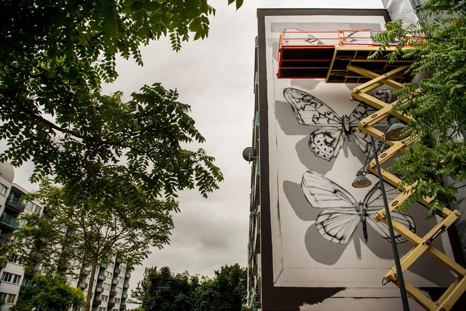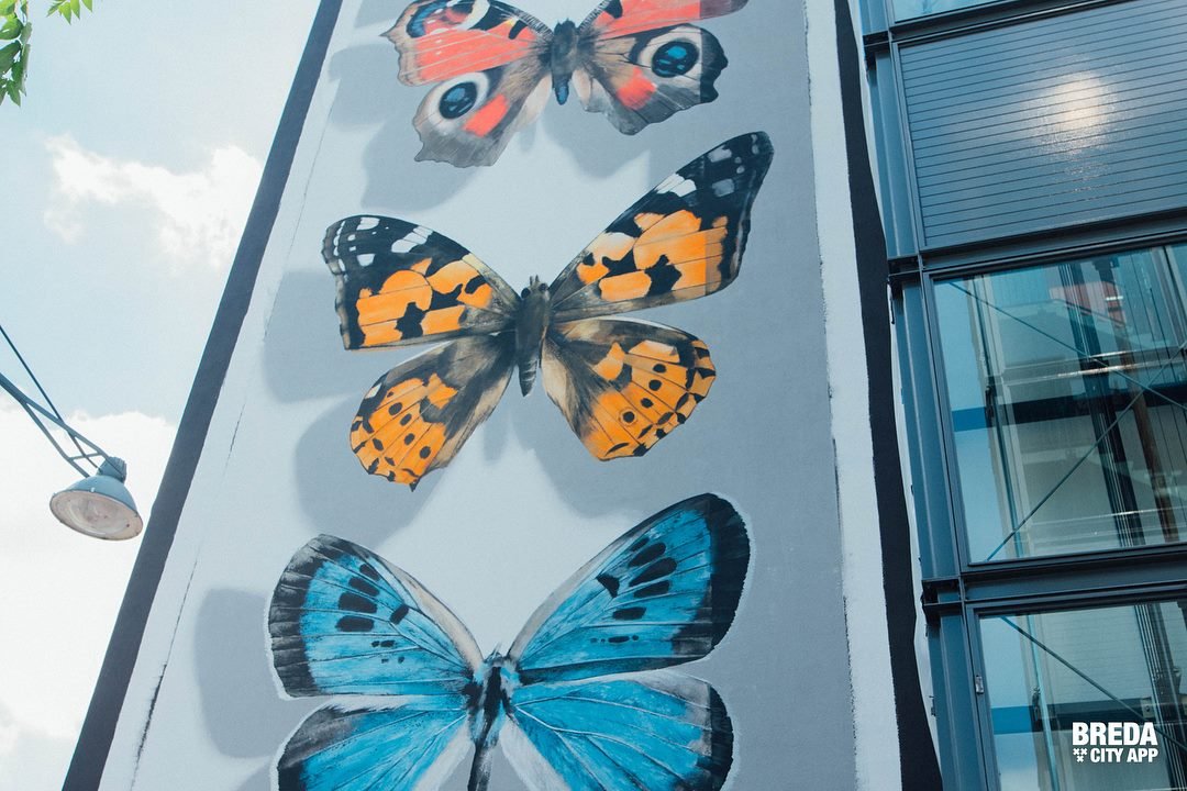 Deze muurschildering wordt gemaakt door Mantra. De vlinders die de Franse straatkunstenaar maakt zijn vlinders die in Nederland bijna uitgestorven zijn. Op dit moment worden de vlinders voorzien van een mooi kleurtje en naar verwachting is het kunstwerk dit weekend helemaal af!
