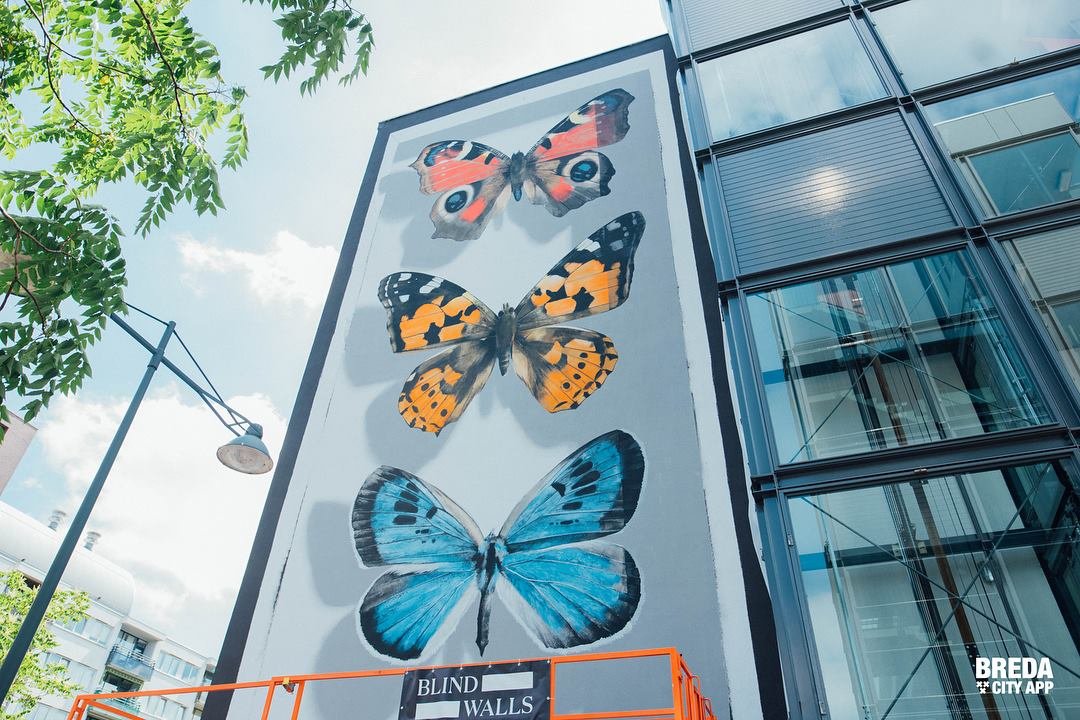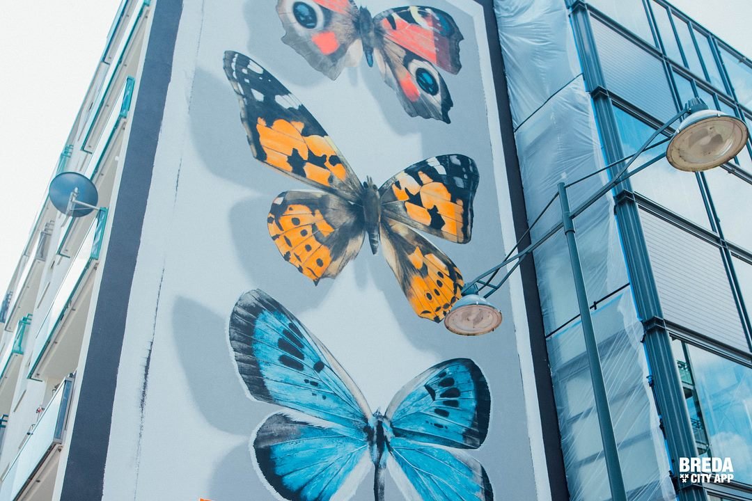 Het is twintig meter hoog en er staan grote gekleurde vlinders op... Deze week wordt de hoogste muurschildering van de Bredase Blind Walls Gallery gemaakt op een flat aan de Tuinzigtlaan. De Franse kunstenaar Mantra legt komende dagen de laatste hand aan dit vrolijke stuk kunst dat onderdeel uitmaakt van de verzameling murals in Breda.