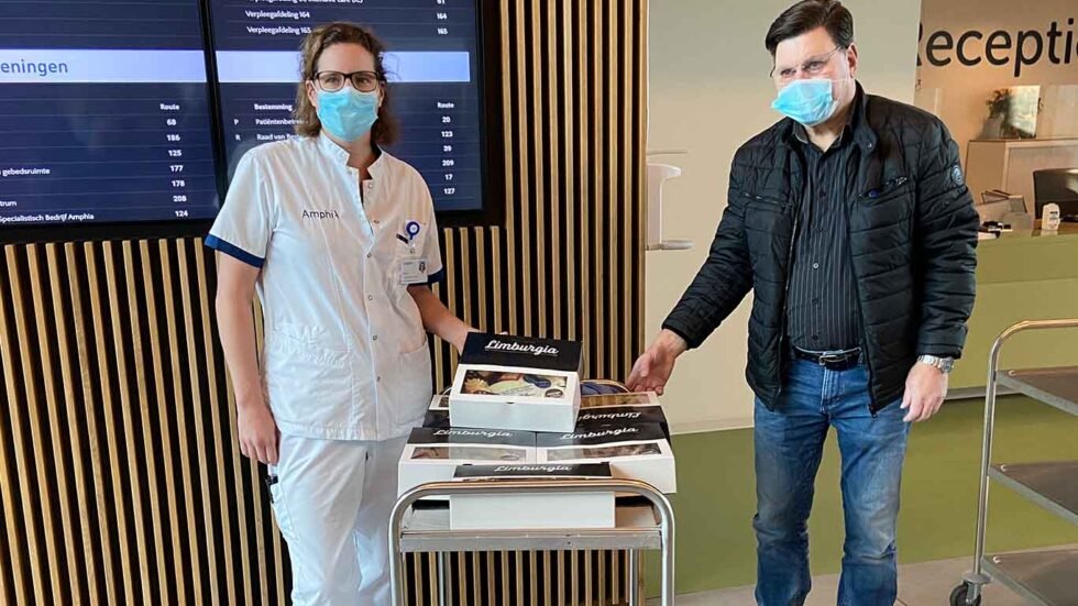 Dirk Zonnevijlle (van Limburgia en bestuurslid van de winkeliersvereniging) bracht vanmorgen vroeg een bezoekje aan het Amphia, waar Annet Niemantsverdriet (teamleider IC) hem ontving. De taarten zijn overhandigd en intern verdeeld onder het personeel. We danken het IC personeel en al het zorgend personeel voor hun harde werk in deze zware tijden. Vanuit het winkelcentrum doen we er alles aan om een zo’n veilig mogelijke winkelomgeving te bieden.