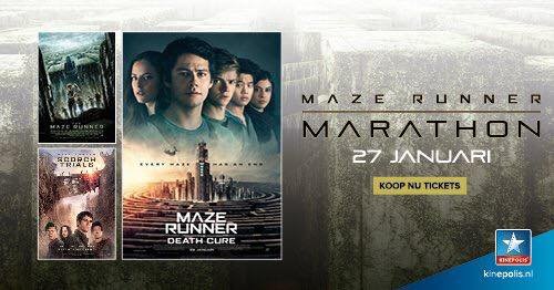 Alle drie delen van Maze Runner zien? Dat kan bij Kinepolis Breda! Op 27 jan vertonen ze, om je geheugen op te frissen, eerst de eerste 2 delen van deze geweldige film! Daarna krijg je het gloednieuwe 3e deel te zien