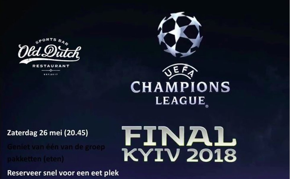 Deze zaterdag is dé champions league finale en deze, hopelijk mooie wedstrijd, kun je live zien bij Restaurant Old Dutch.