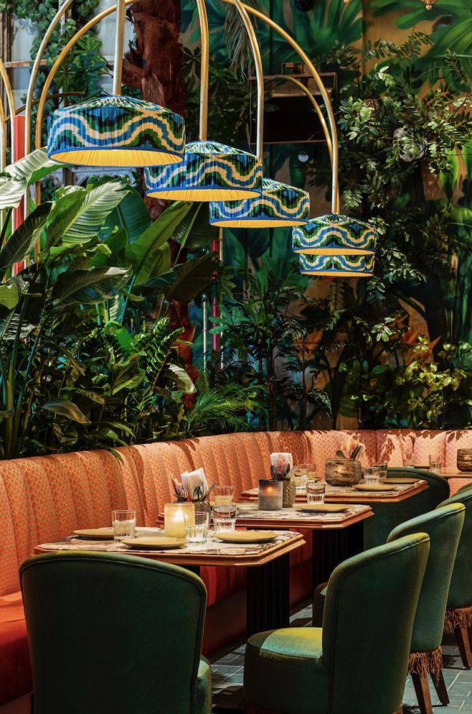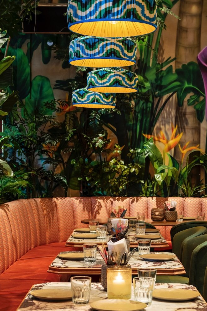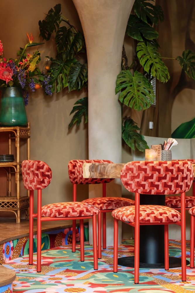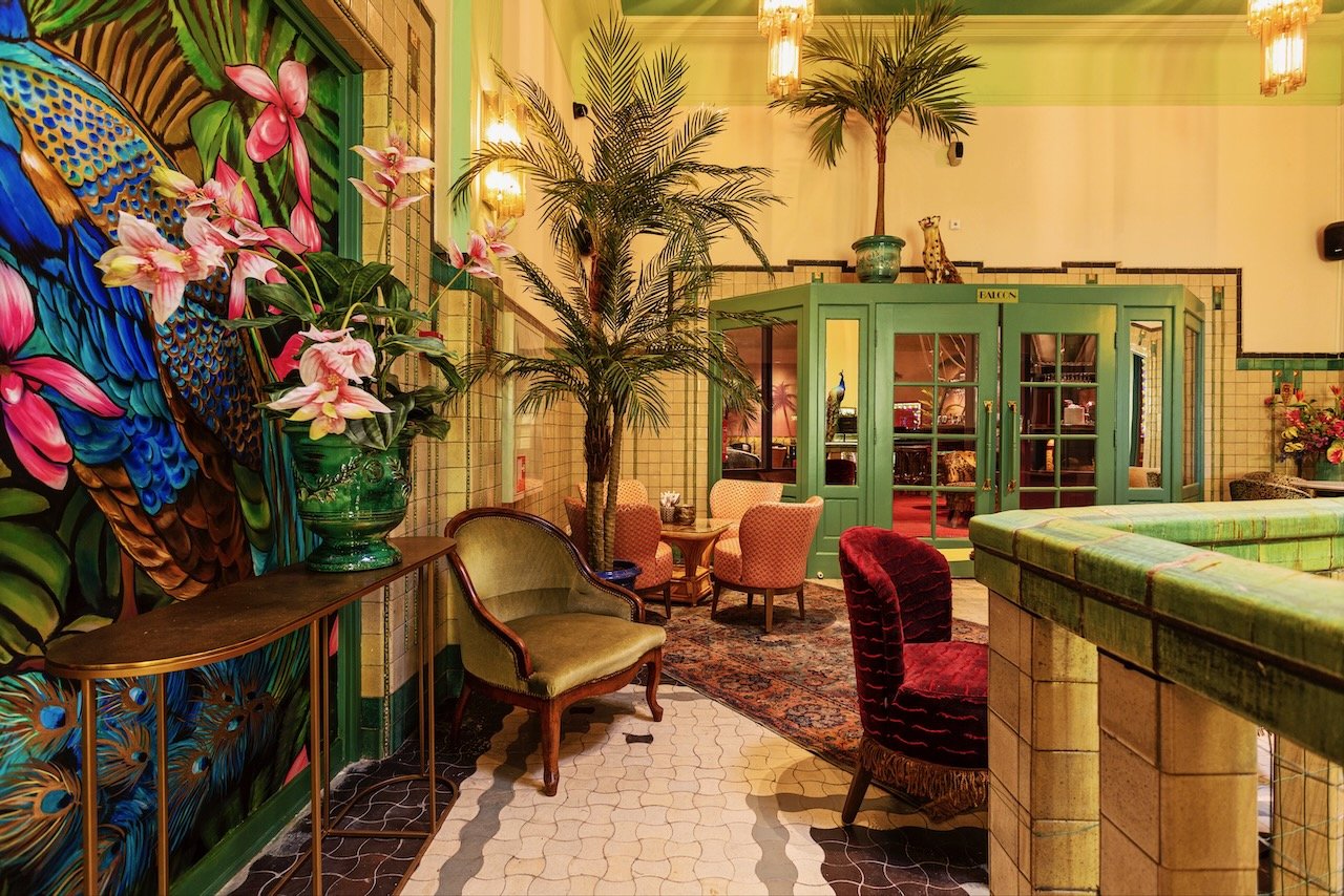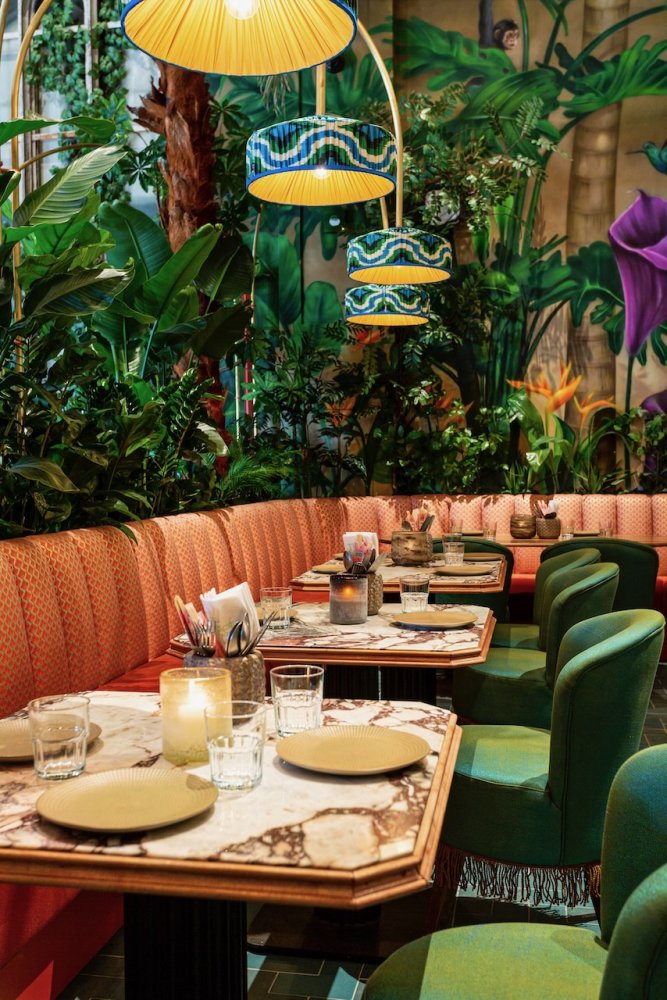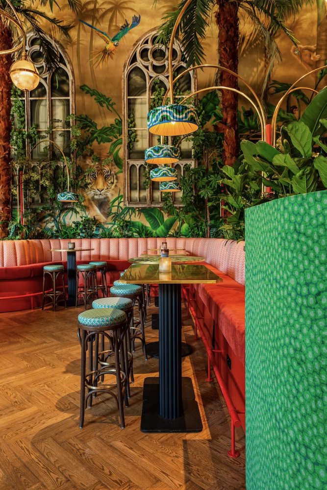 Als je binnen komt wordt je oog als eerste getrokken naar de gigantische muurschildering, die over de hele lengte van het pand loopt. Je wordt meegenomen in een dichte groene jungle die overgaat in de ondergaande zon aan het strand.