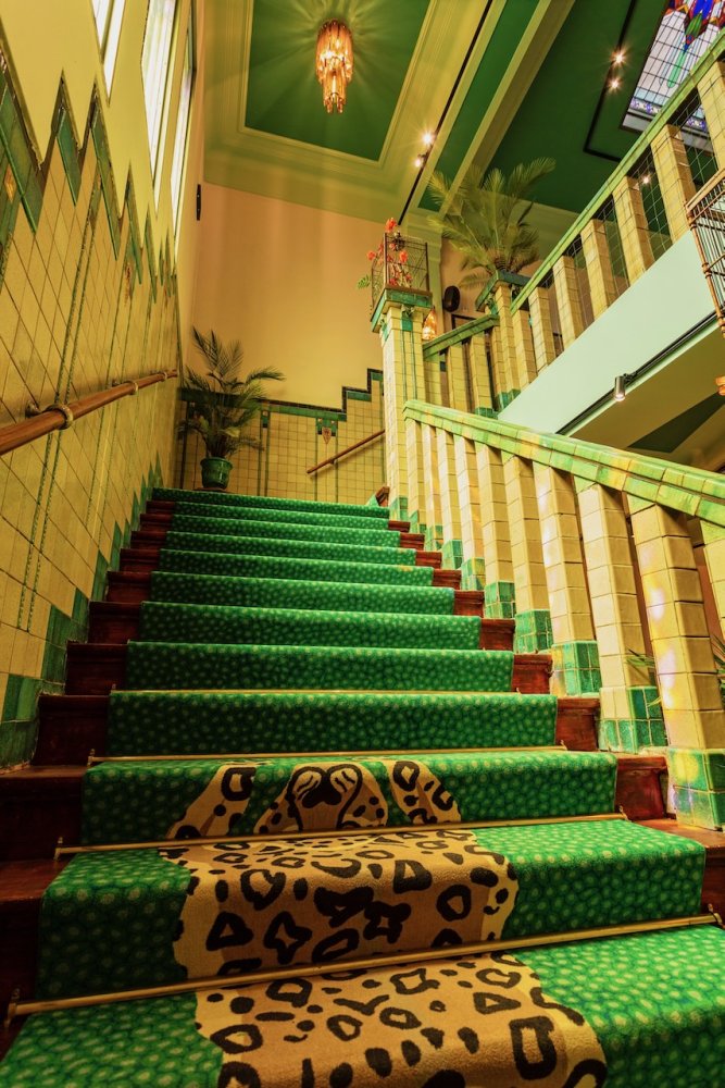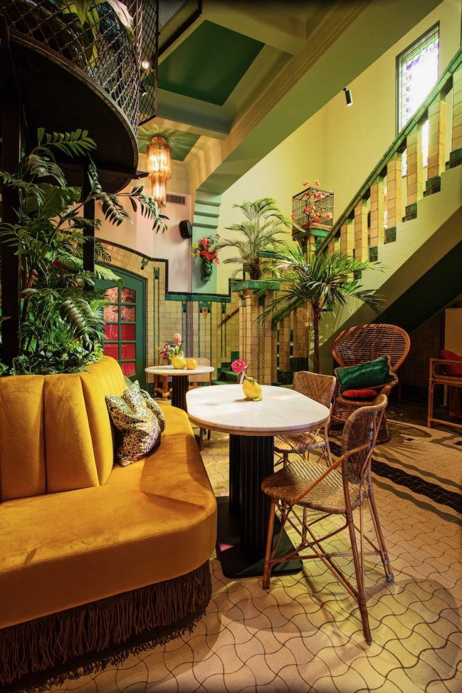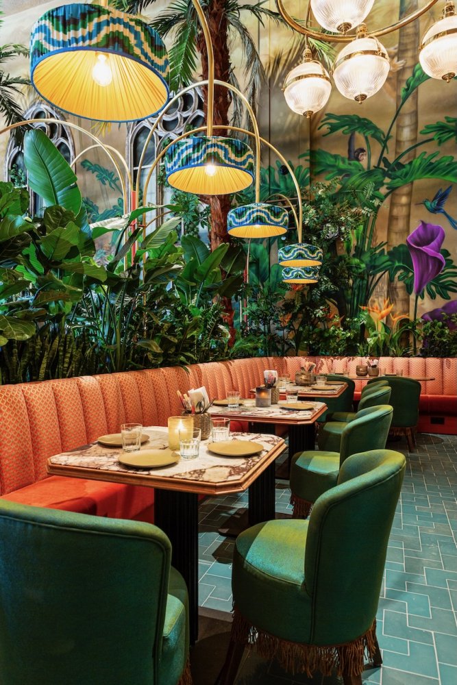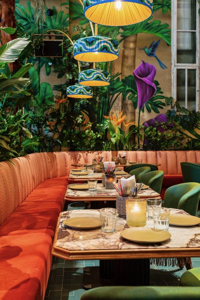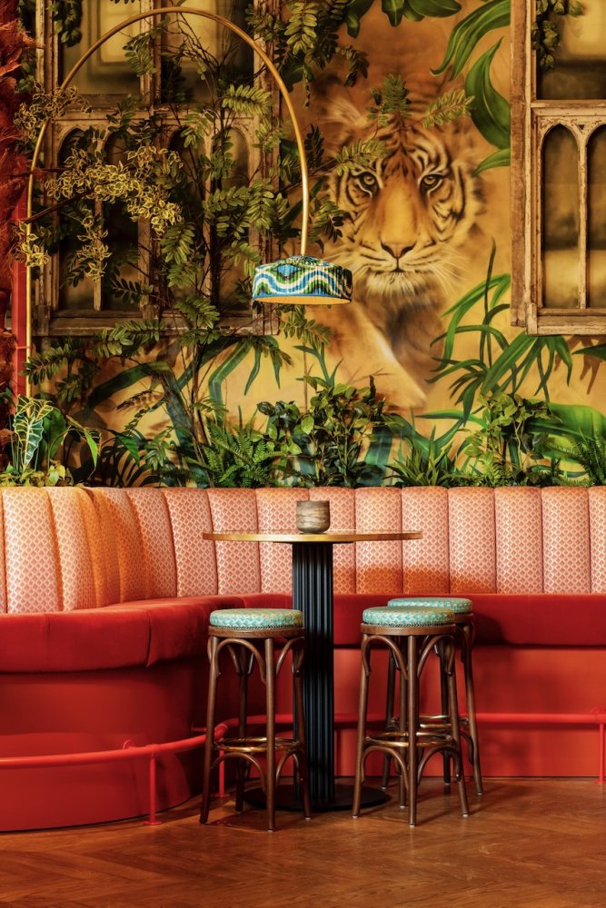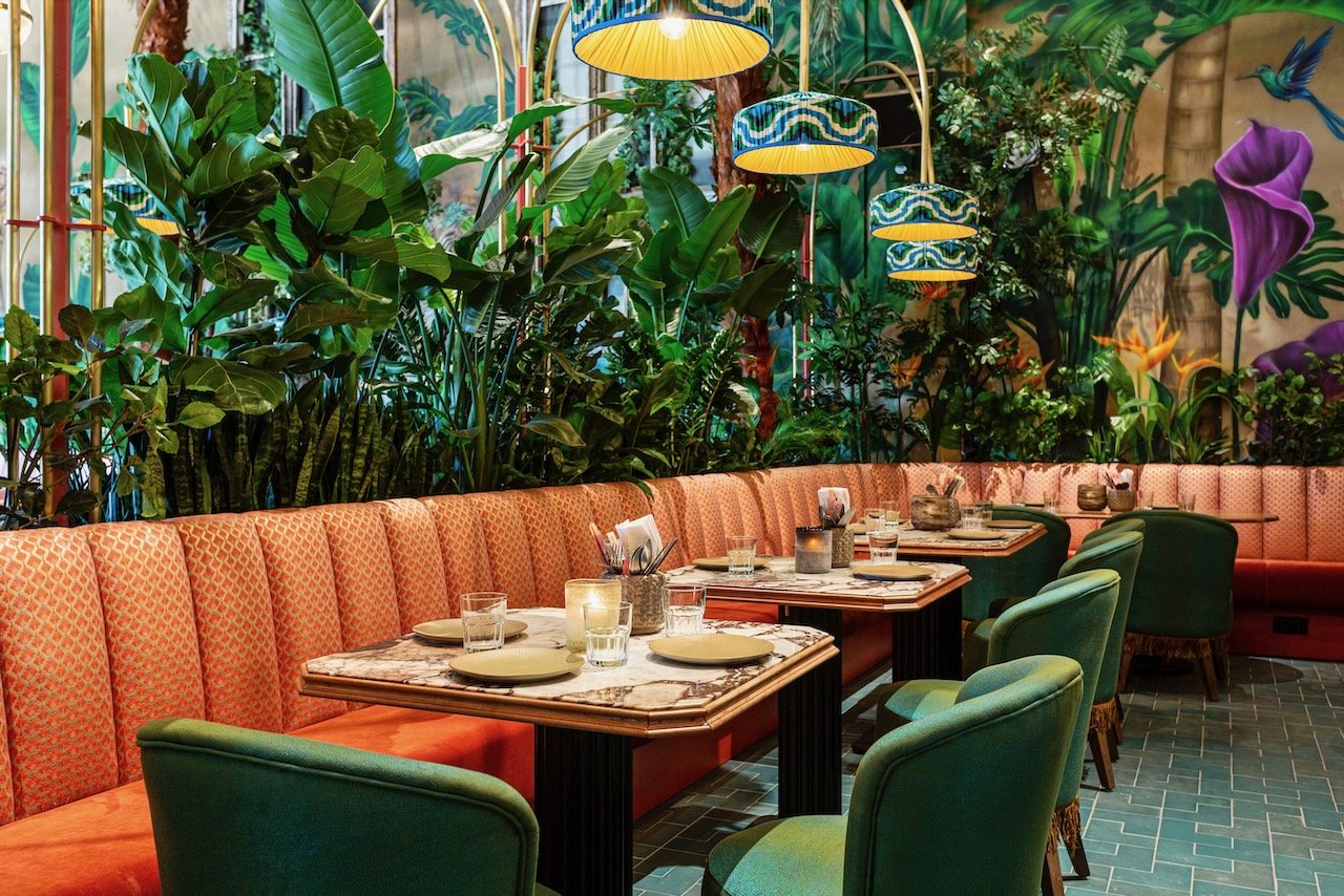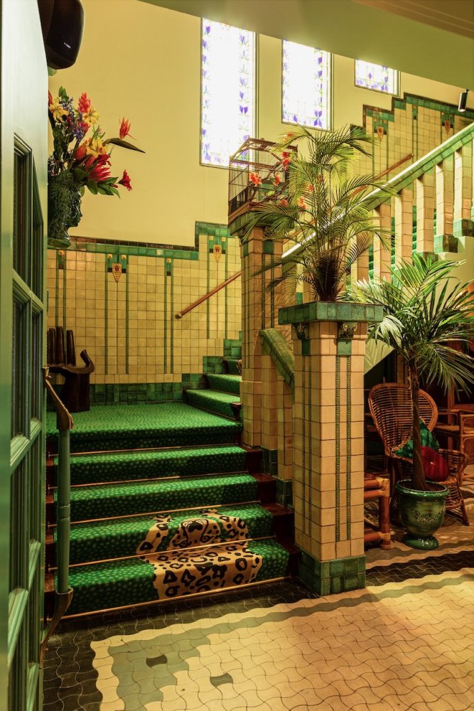 Als je binnen komt wordt je oog als eerste getrokken naar de gigantische muurschildering, die over de hele lengte van het pand loopt. Je wordt meegenomen in een dichte groene jungle die overgaat in de ondergaande zon aan het strand.