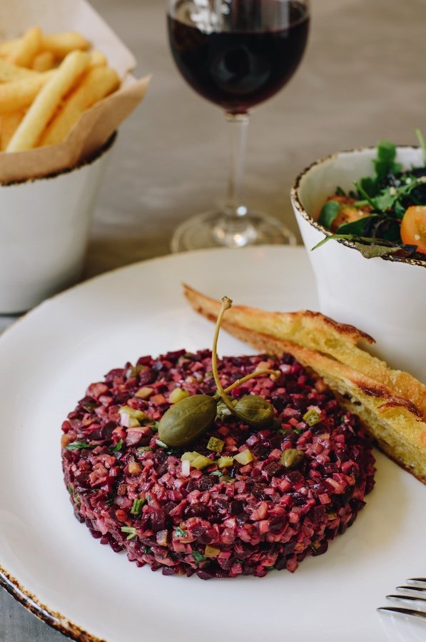 Kastanjechampignon, rode biet, soya, rode bietensap, sjalot, kappertjes, peterselie, augurk, olijfolie, smoked zeezout, zuurdesemtoast, salade, verse frietjes