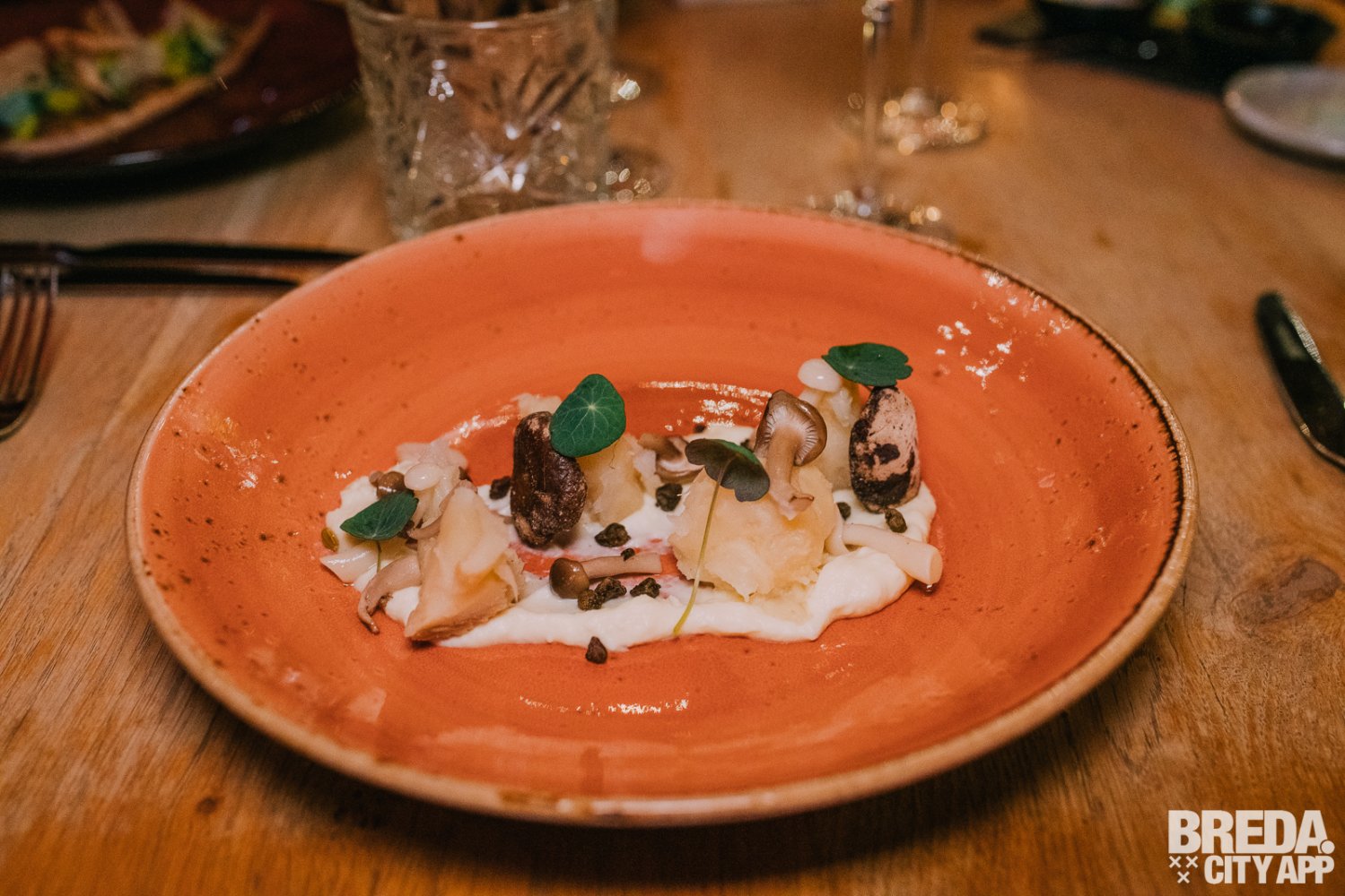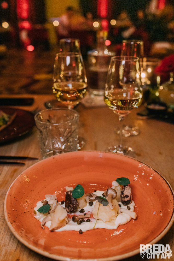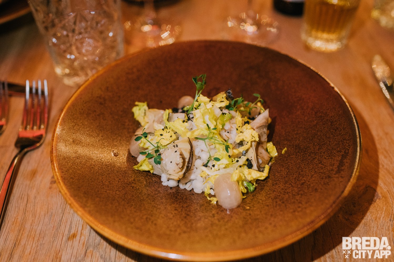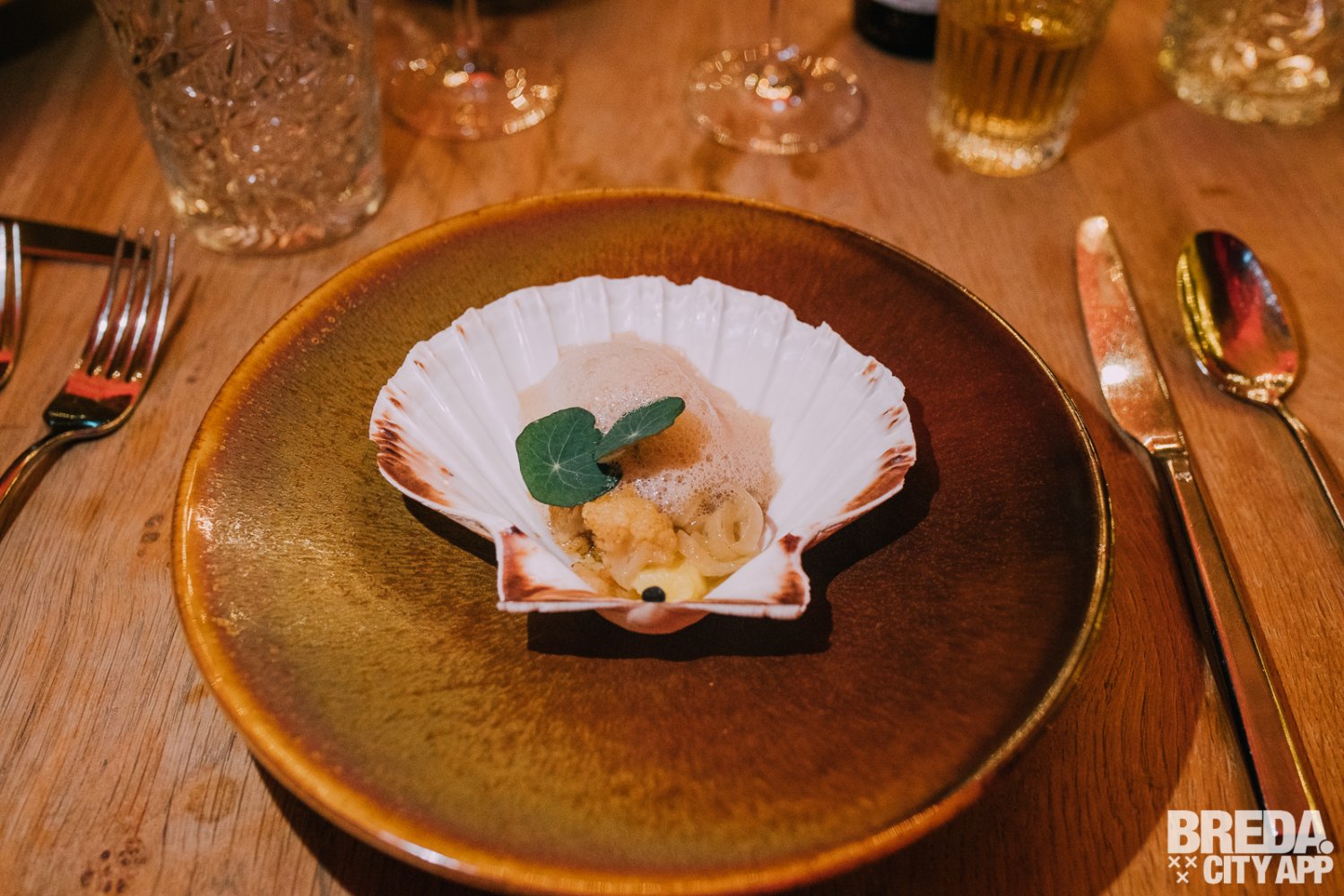Voor de derde gang krijgen we een coquille met hazelnoot en ui. Het gerecht wordt geserveerd in de schelp van de coquille, niet alleen een lust voor het oog maar ook super lekker.