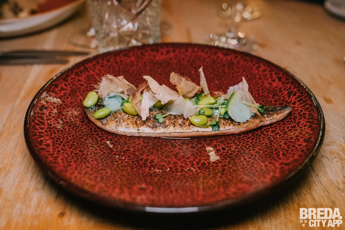 De eerste gang is een makreel met sobrasada (een typisch Spaanse worst) en edamame boontjes. De vis is mooi gegaard en smelt bijna op je tong. De combinatie met de sobrasada en de edamame is verrassend en perfect in balans.