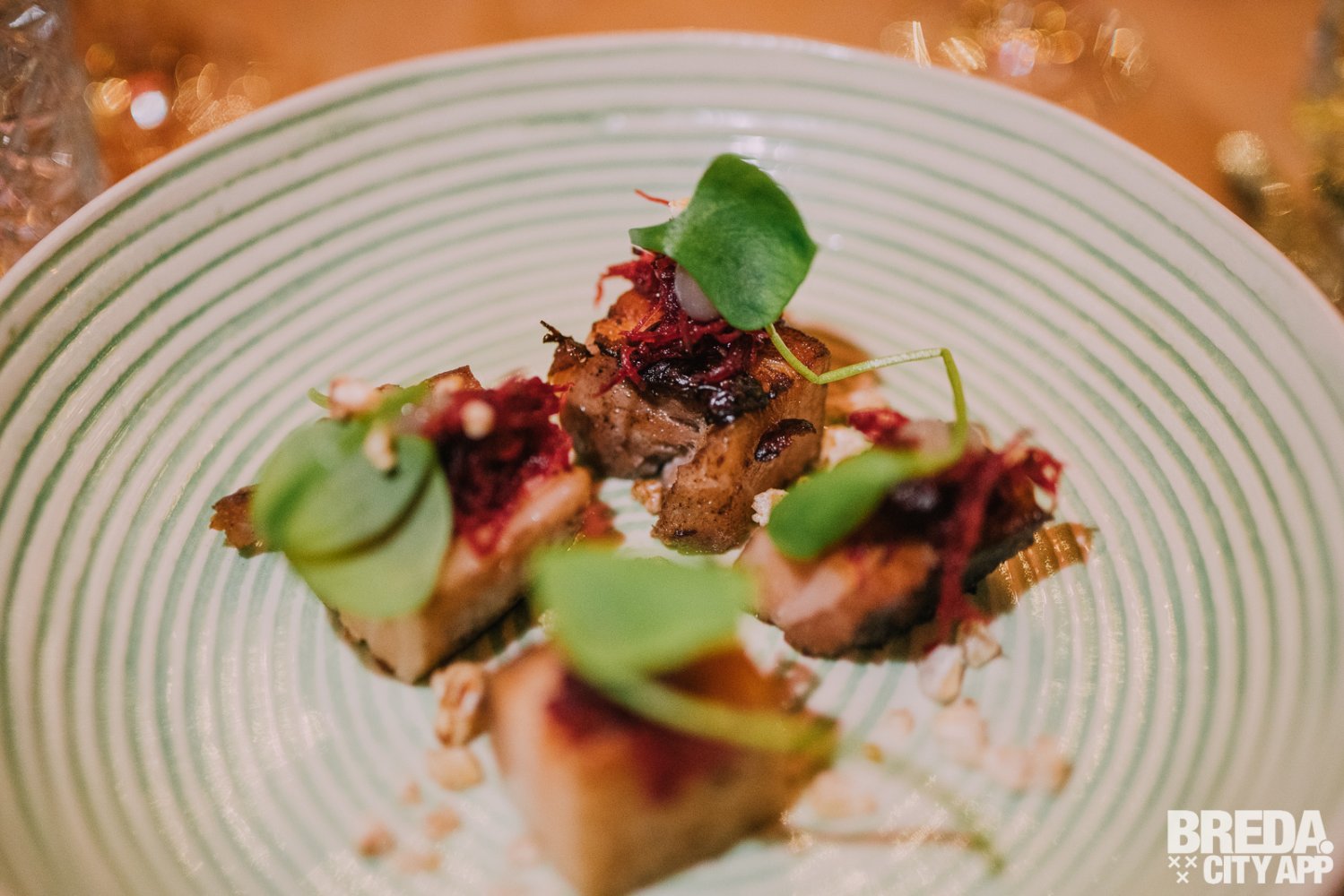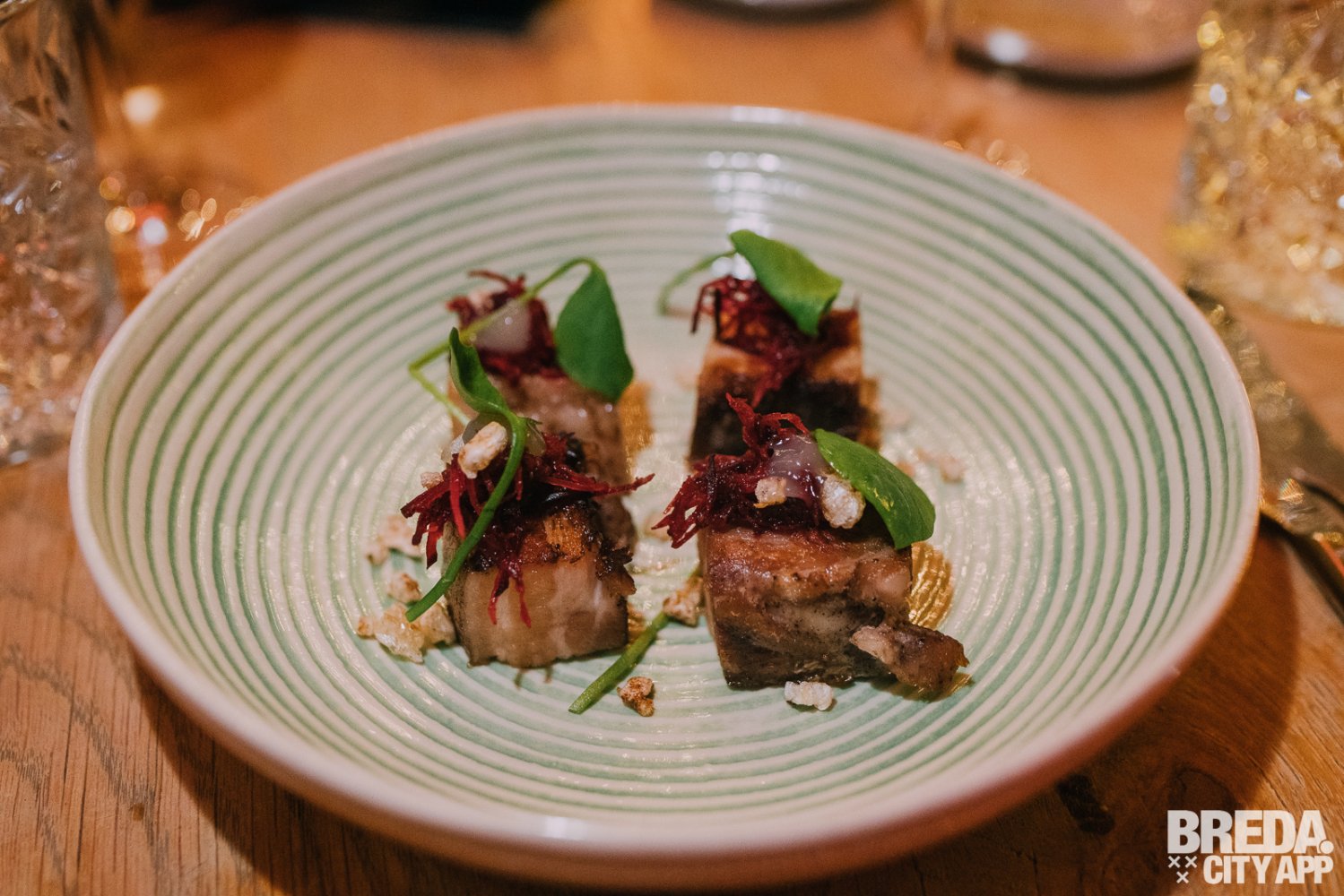 Gang twee is buikspek met citrus en rode biet. Het vlees is super mals en licht krokant gebakken, echt heerlijk.