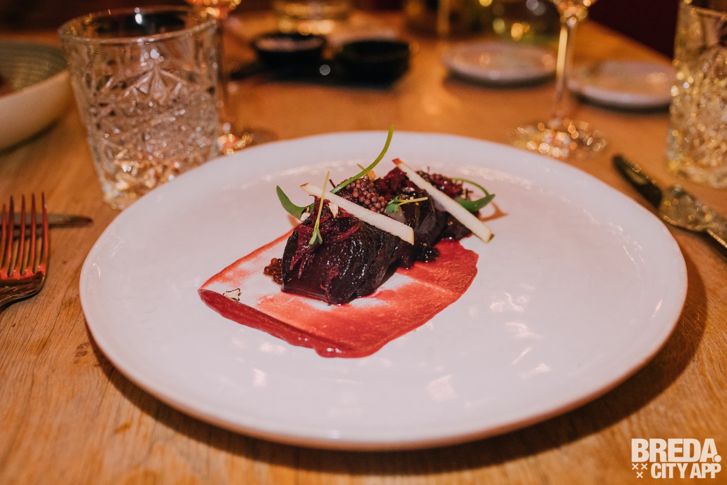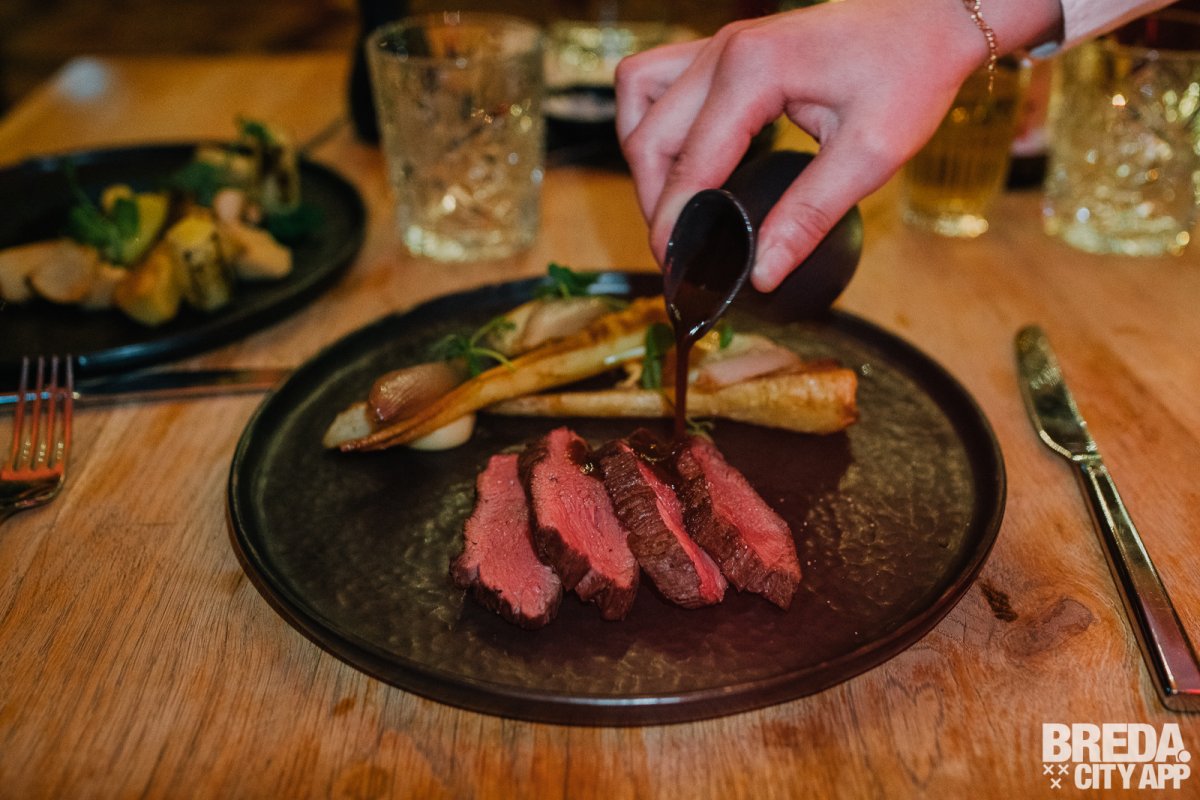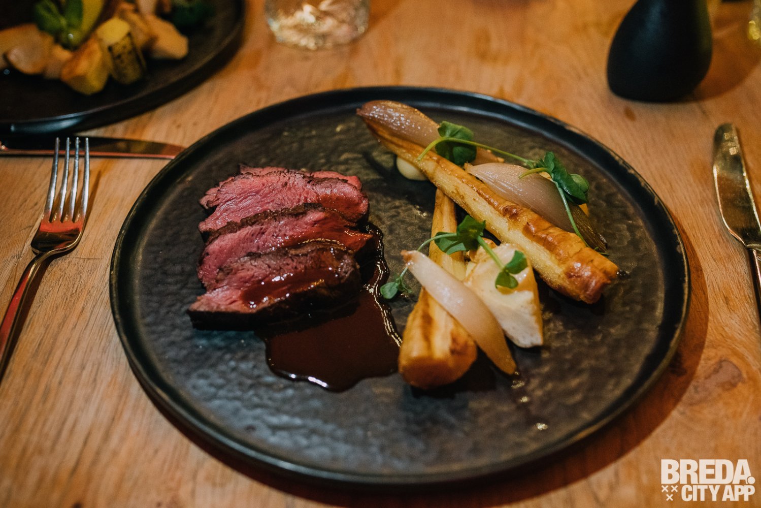 De ossenhaas met pastinaak en rode biet is de vierde gang. Aan tafel wordt de jus uitgeschonken over het vlees. Het is een mooi aards gerecht, dat goed past bij de tijd van het jaar. Het vlees is mooi rosé gegaard en lekker mals.