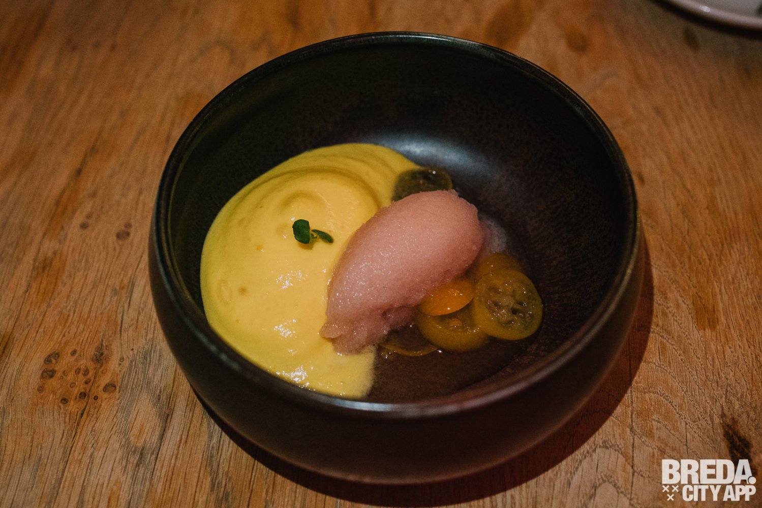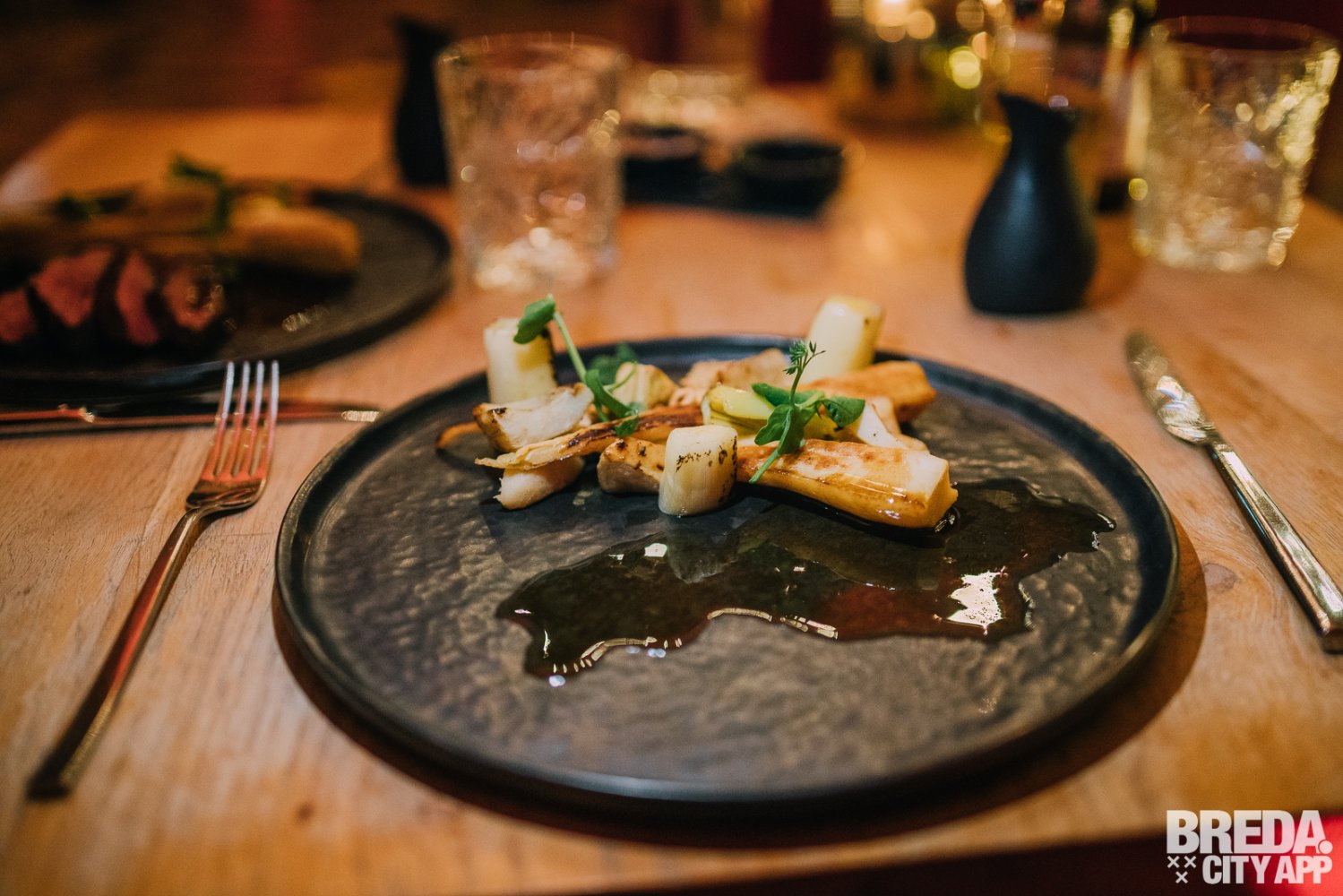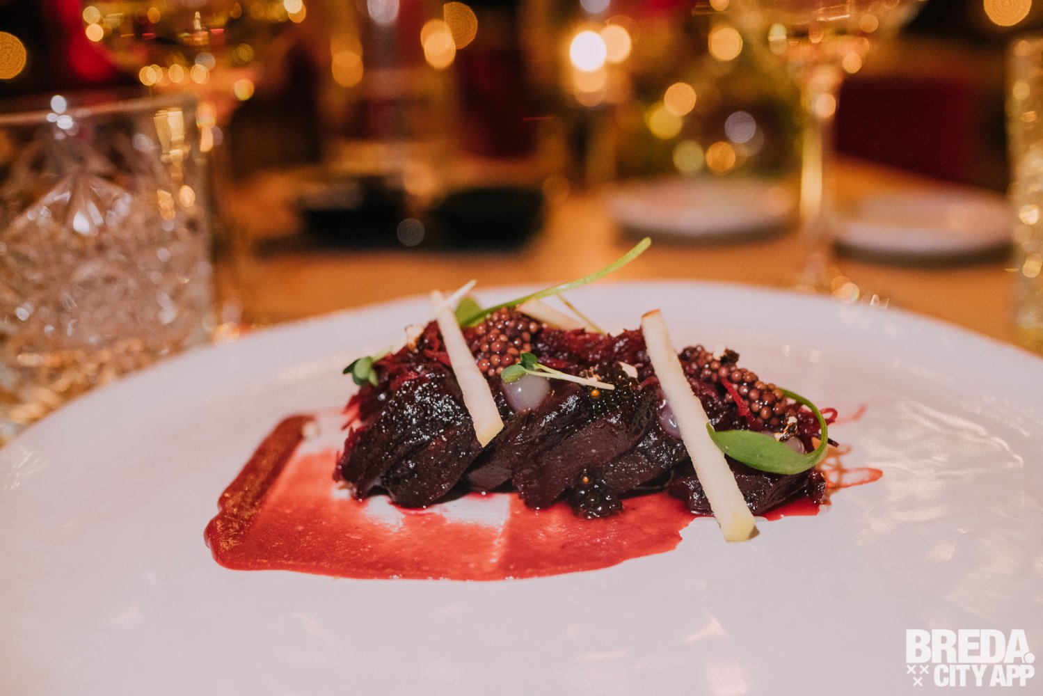 De ossenhaas met pastinaak en rode biet is de vierde gang. Aan tafel wordt de jus uitgeschonken over het vlees. Het is een mooi aards gerecht, dat goed past bij de tijd van het jaar. Het vlees is mooi rosé gegaard en lekker mals.
