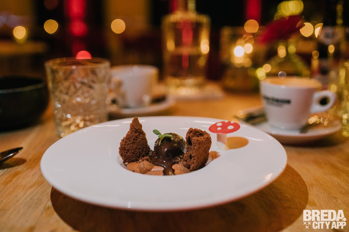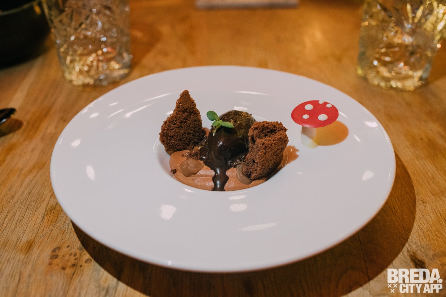 We sluiten het diner af met een heerlijk chocolade dessert met de omschrijving kastanje, pure chocolade, gerookt. De verschillende texturen van de krokante koek, het ijs en de mouse maken een prachtig geheel.