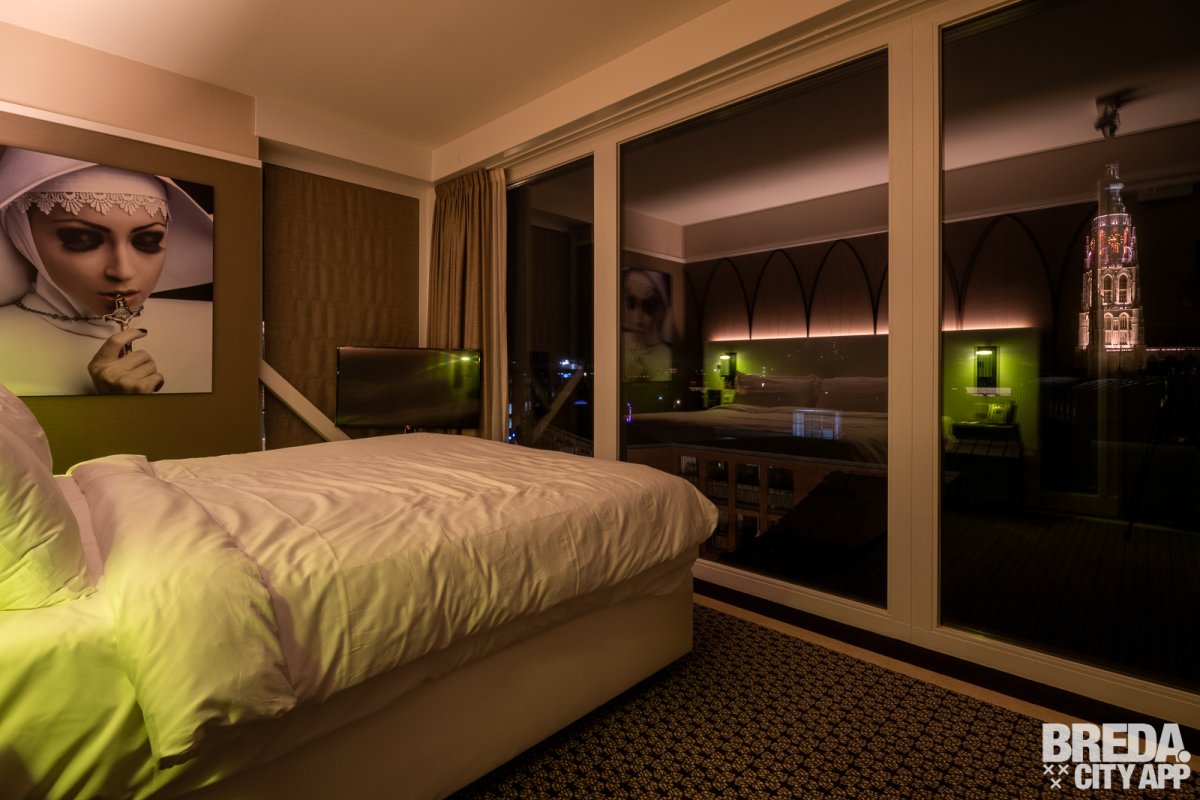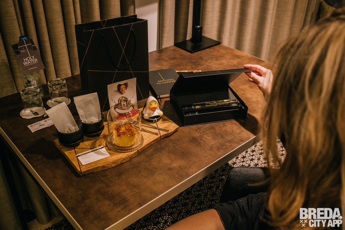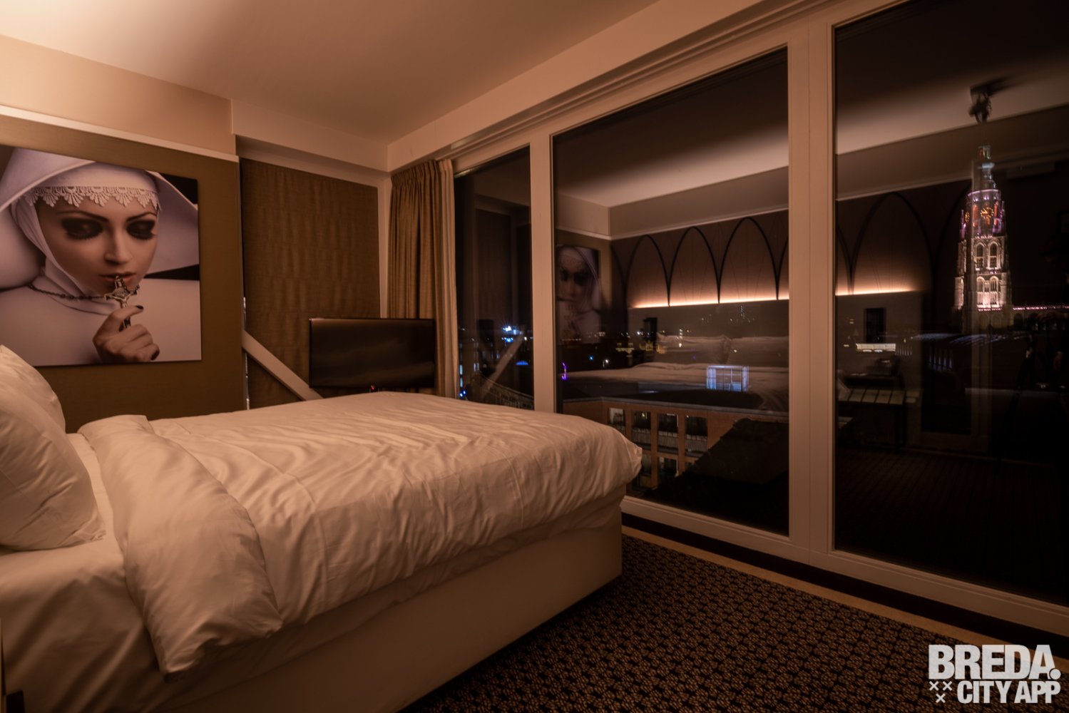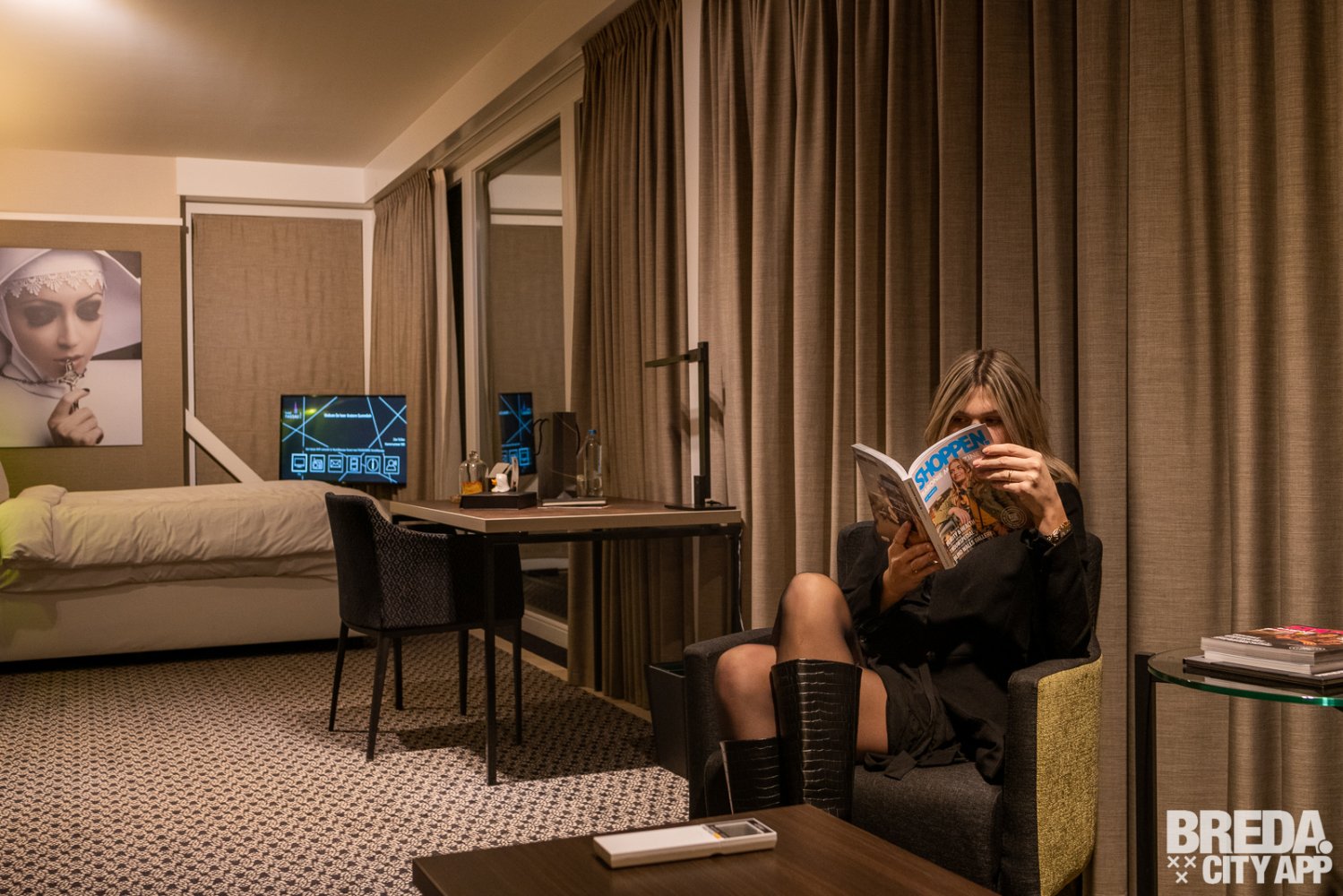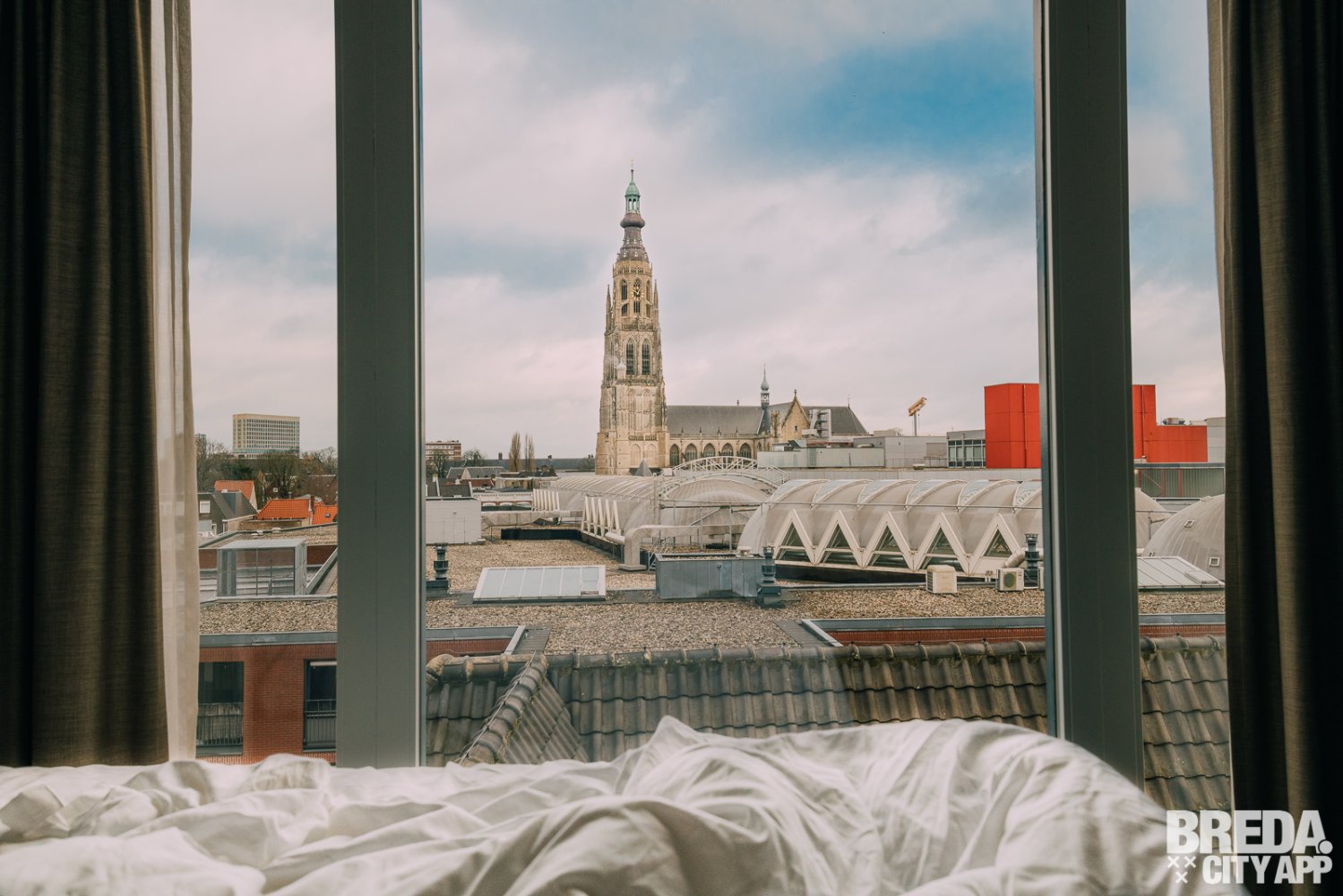 Vanuit deze luxe suite heb je een prachtig uitzicht over de binnenstad en de Grote Kerk van Breda! Daarnaast heeft deze ruime kamer een aparte zithoek en een zeer ruime badkamer met inloopdouche en bad. Op onze kamer worden we verwelkomt met een handgeschreven kaartje en een heerlijk pakket bestaande uit een hemels gebakje, rode en witte wijn en relax thee.