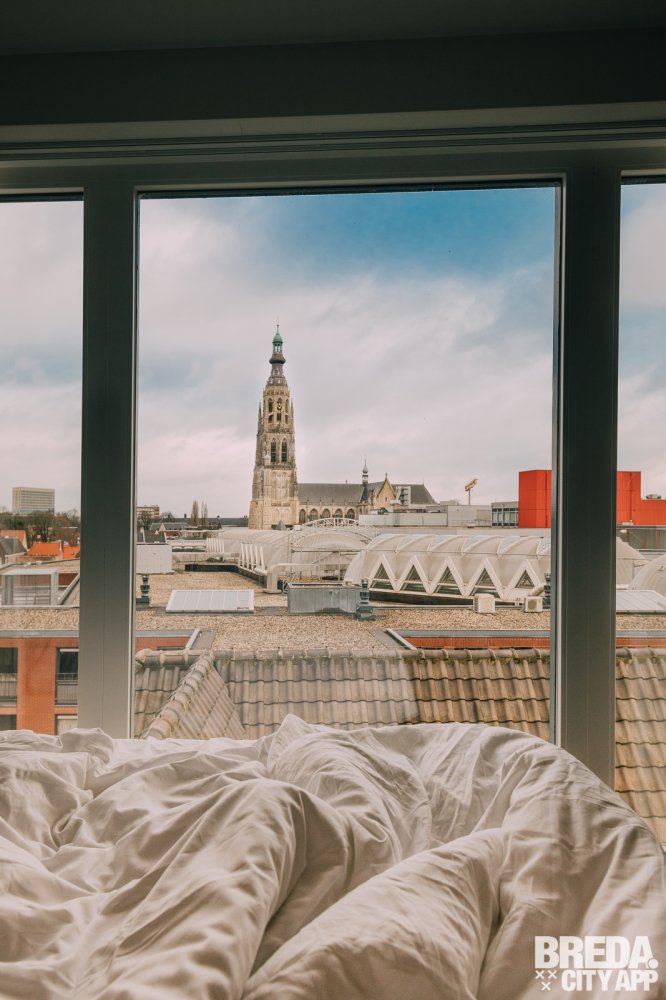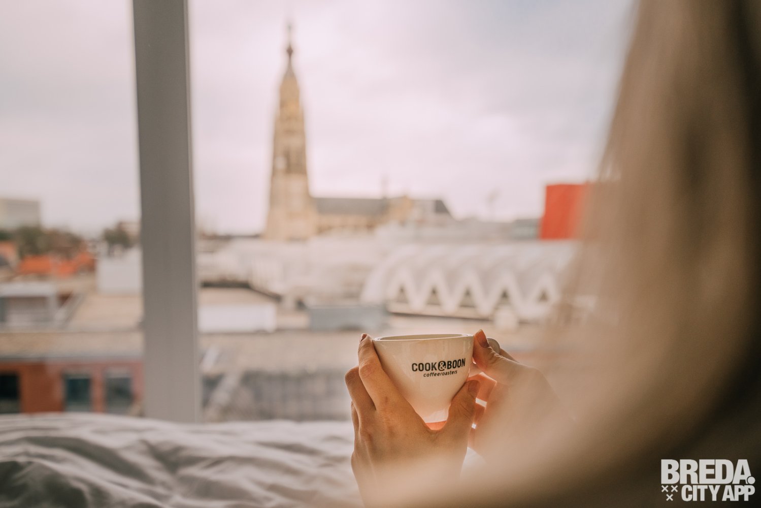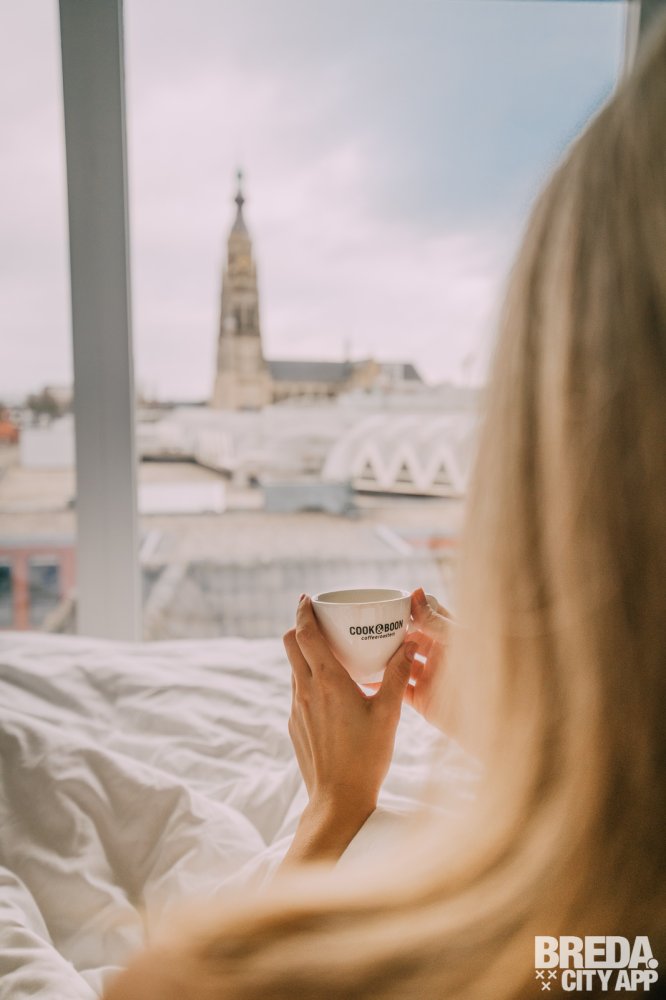 In ons bed praten we nog even na over deze bijzondere ervaring en vallen we in slaap in het heerlijke Swiss Sense bed. De volgende ochtend worden we wakker met het prachtige uitzicht op de Grote Kerk en drinken we een heerlijk kopje koffie in bed. Alleen deze ervaring is het al waard om de kamer te boeken.