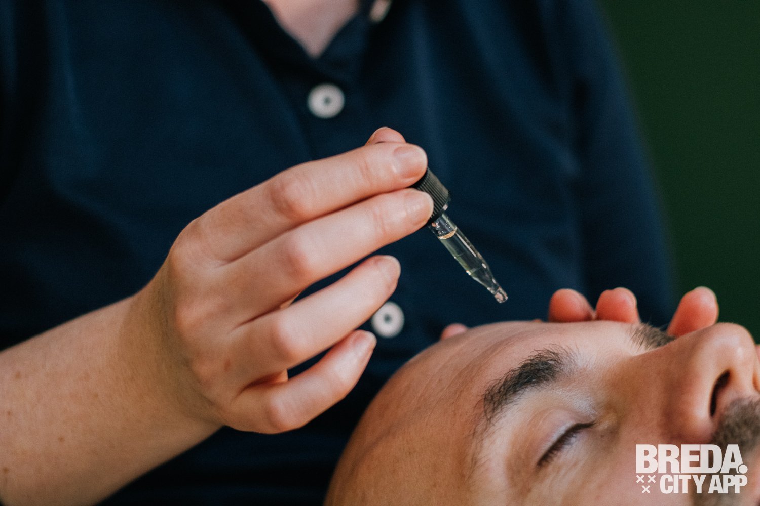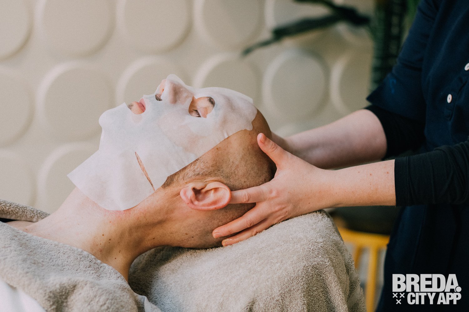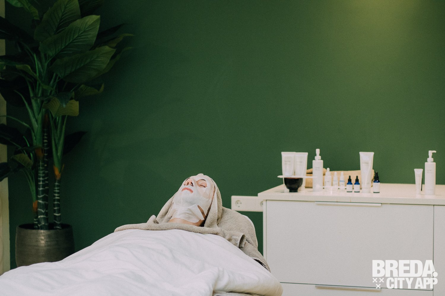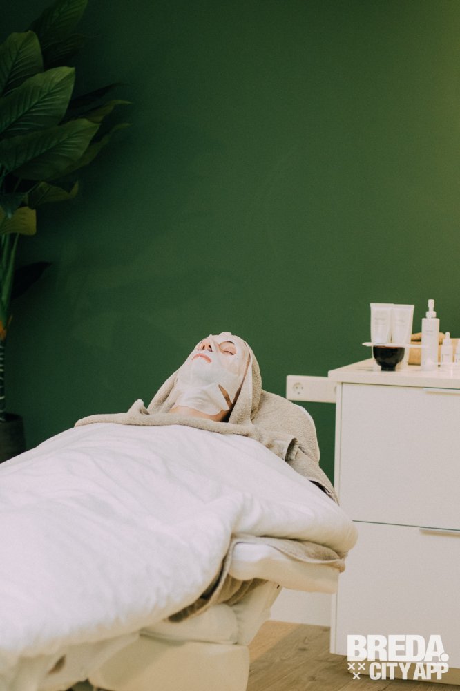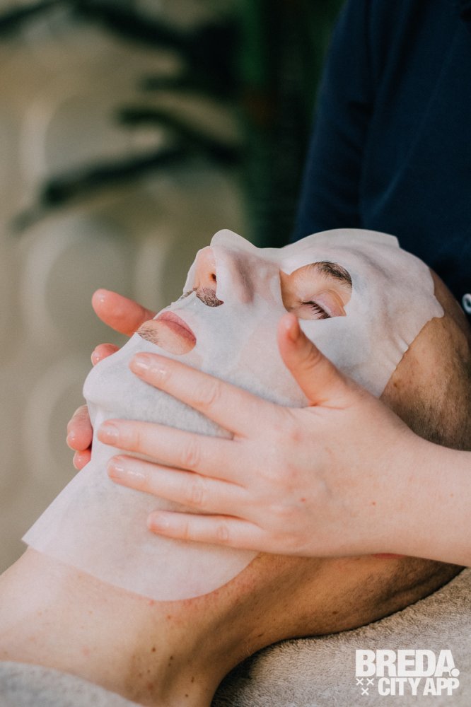 De behandeling nadert zijn einde en ik krijg nog een hydraterend masker op mijn gezicht. Ik blijf een minuut of tien alleen in de kamer achter terwijl het masker zijn werk doet. Mijn huid absorbeert het vocht, waardoor ik helemaal tot rust kan komen. Bertine maakt de behandeling af met een hoofdhuidmassage en verwijdert dan het hydraterende masker. Tot slot brengt ze met zorg enkele kleine druppeltjes onder mijn ogen aan. Dit is een speciale dag- en nachtcrème om het gebied rond mijn ogen extra te verzorgen.