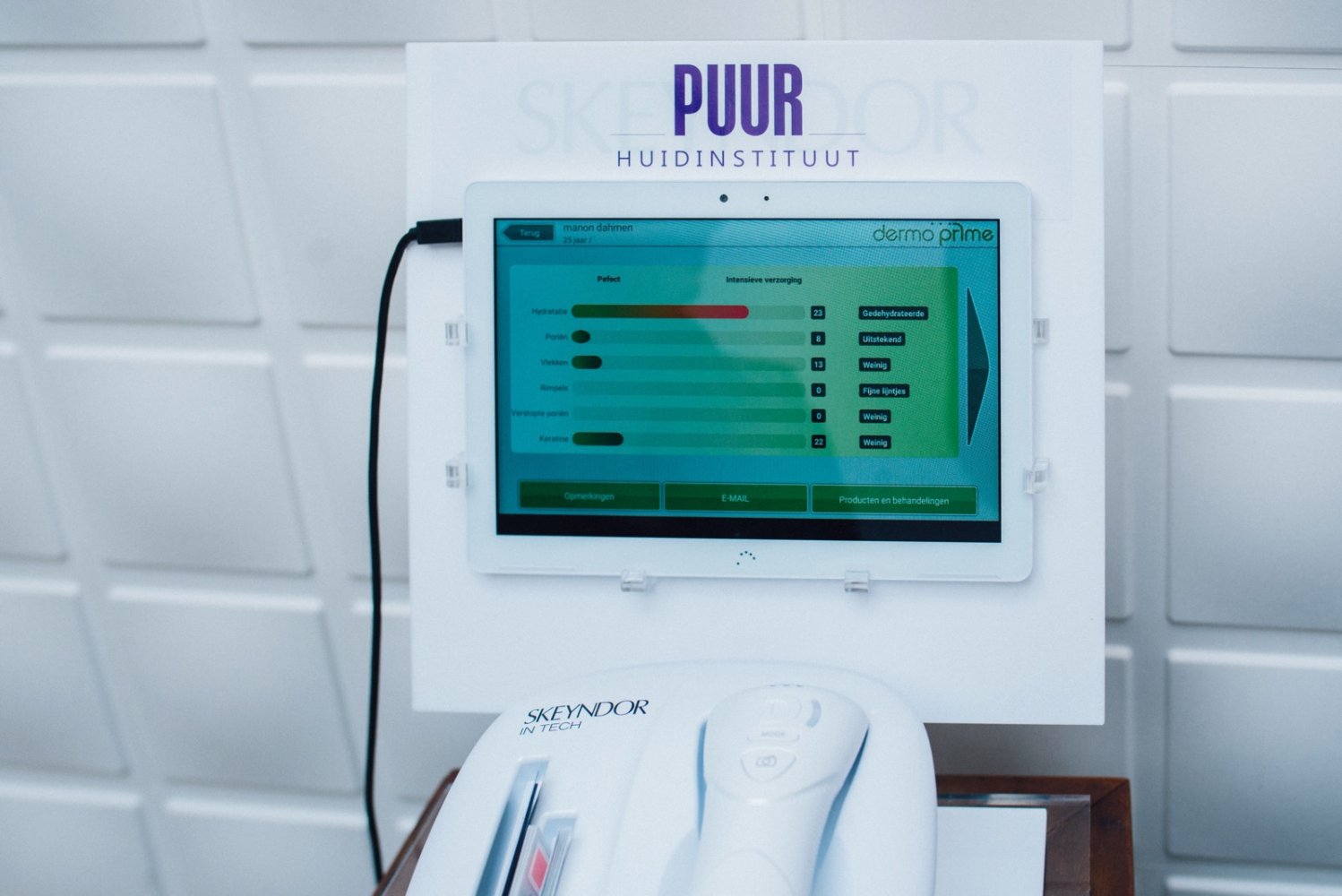 We starten met een huidanalyse. Deze kun je kosteloos en vrijblijvend aanvragen bij PUUR. Een huidanalyse geeft je veel inzicht in jouw huid, het verleden en de toekomst ervan. Verschillende onderdelen komen aanbod waaronder hydratatie, poriën en fijne lijntjes. Omdat schoonheid van binnenkomt kijkt Edith niet alleen naar de analyse die via een professioneel apparaat geschiedt, maar stelt ze ook gericht vragen over mijn leefstijl, gezondheid en eet-patroon. De uitslag voor mij luidt alsvolgt; een gedehydratheerde huid, door het gebruiken van een verkeerd product. Edith gaat de behandeling hierop aanpassen, passende producten worden bij elkaar gezocht om het resultaat optimaal te laten zijn.