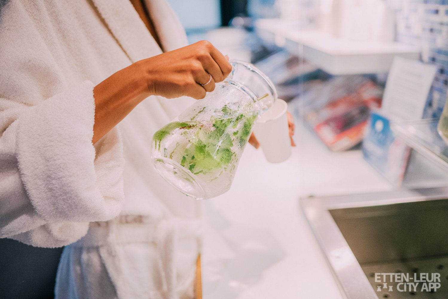 De wellness beschikt over een gezellige ruimte met tafels en luxe fauteuils, waar je eventueel ook een hapje en drankje kunt doen. Via de telefoon kun je zelf een bestelling maken bij het restaurant, waarna alles bij je aan tafel wordt geserveerd. Er staan ook kannen met gekoeld water en verse munt of sinaasappelen klaar. Wat een luxe.