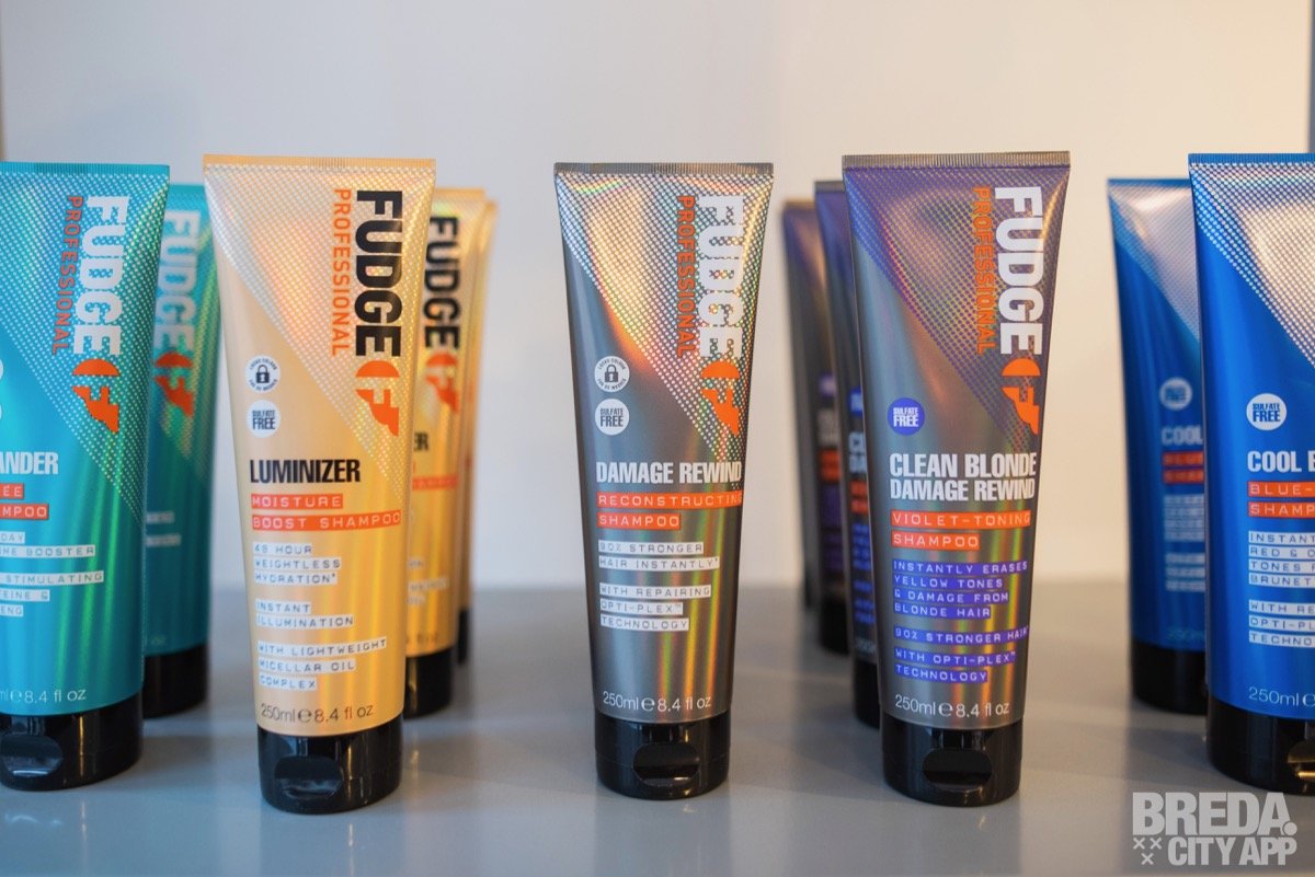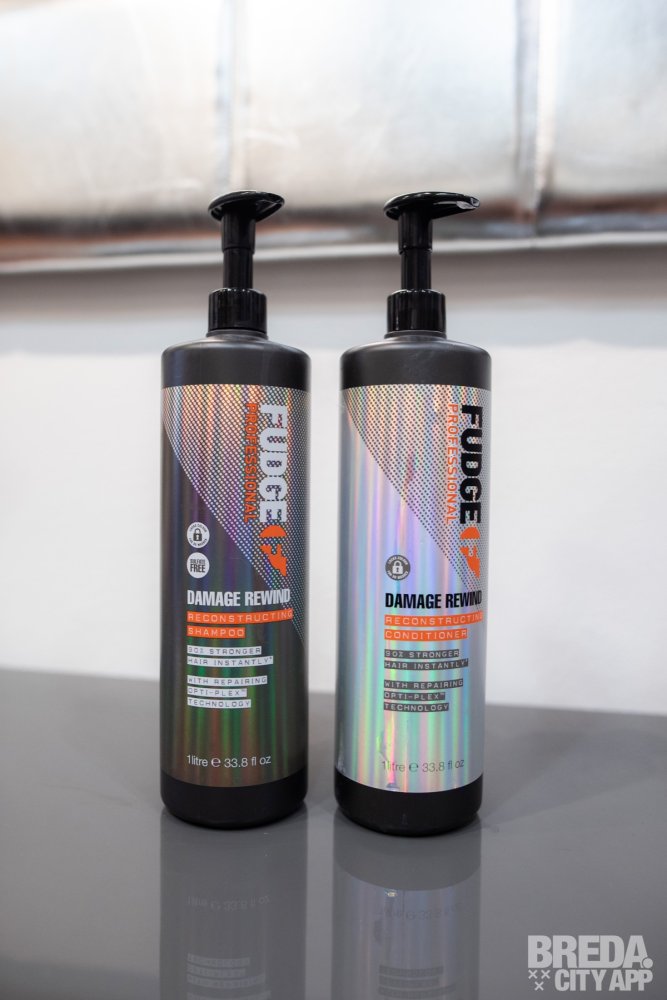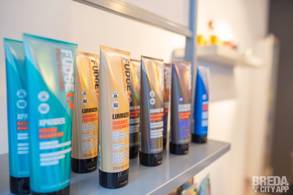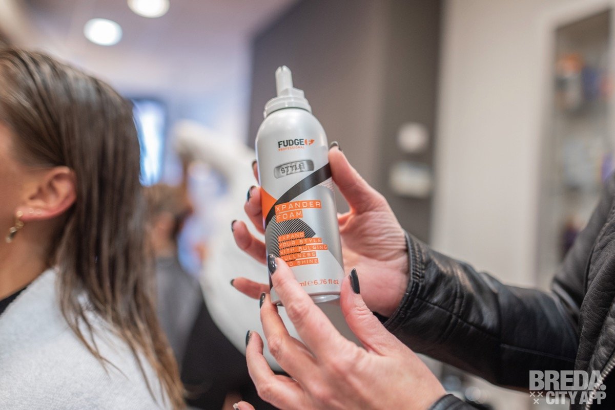 Na het uitspoelen van de conditioner neem ik plaats in een andere stoel en word mijn haar voorzichtig geborsteld. Vervolgens wordt de 'Xpander Foam' van Fudge aangebracht. Dit is een haarmousse met vezelhechttechnologie die elk haartype letterlijk uitbreid en volume geeft.