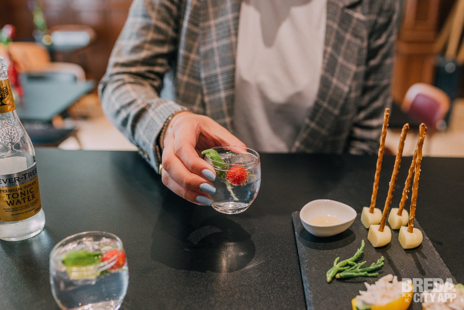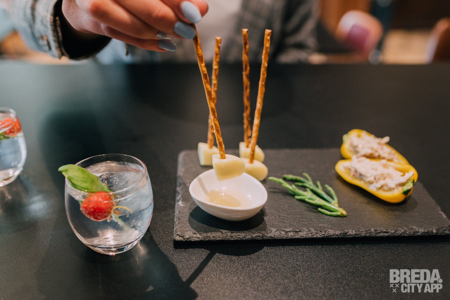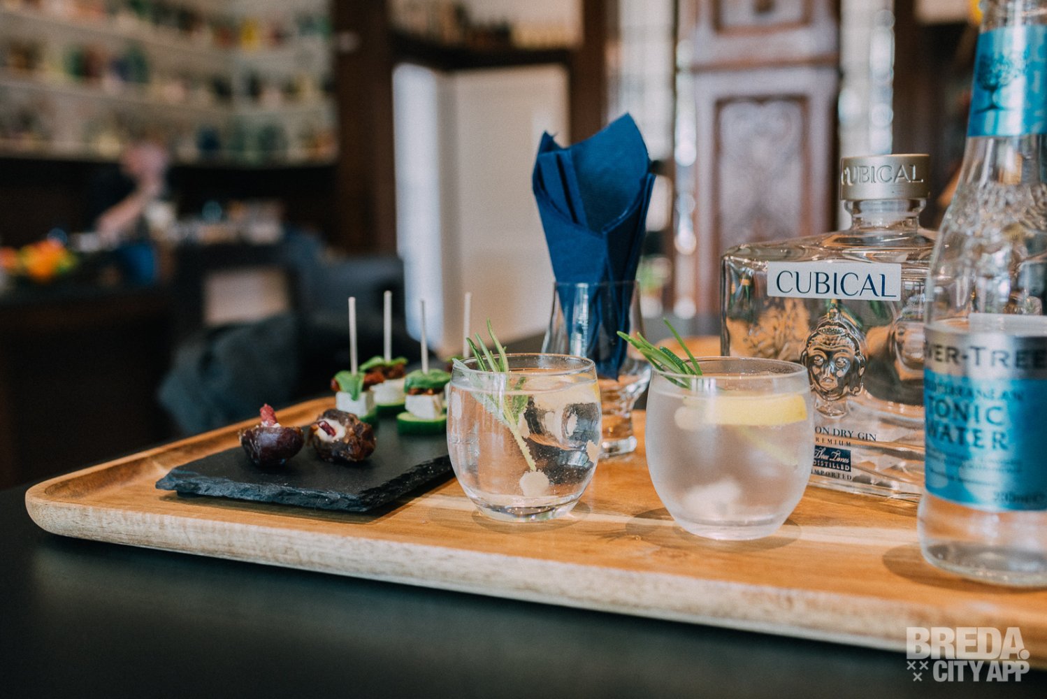 Vandaag komen we voor de High Gin. We nemen een plaatsje in de sfeervolle zaak en al gauw komt eigenaresse Pauline naar ons toe. Ze vertelt ons dat we vandaag verschillende gin's gaan proeven welke we qua smaken rustig gaan opbouwen. We starten met de Cubanical Gin in combinatie met de Fever-Tree Mediterranean tonic. Dit is een klassieke dry gin met niet te veel toeters en bellen en een perfecte start wat ons betreft! De gin tonic is afgetopt met amandelschaafsel, citroen en rozemarijn uit eigen tuin. On the side krijgen we twee heerlijke hapjes. Een dadel met mascarpone en gedroogd fruit en een komkommer hapje met feta, zongedroogde tomaat en basilicum. Dit combineert uitstekend bij de eerste gin tonic.