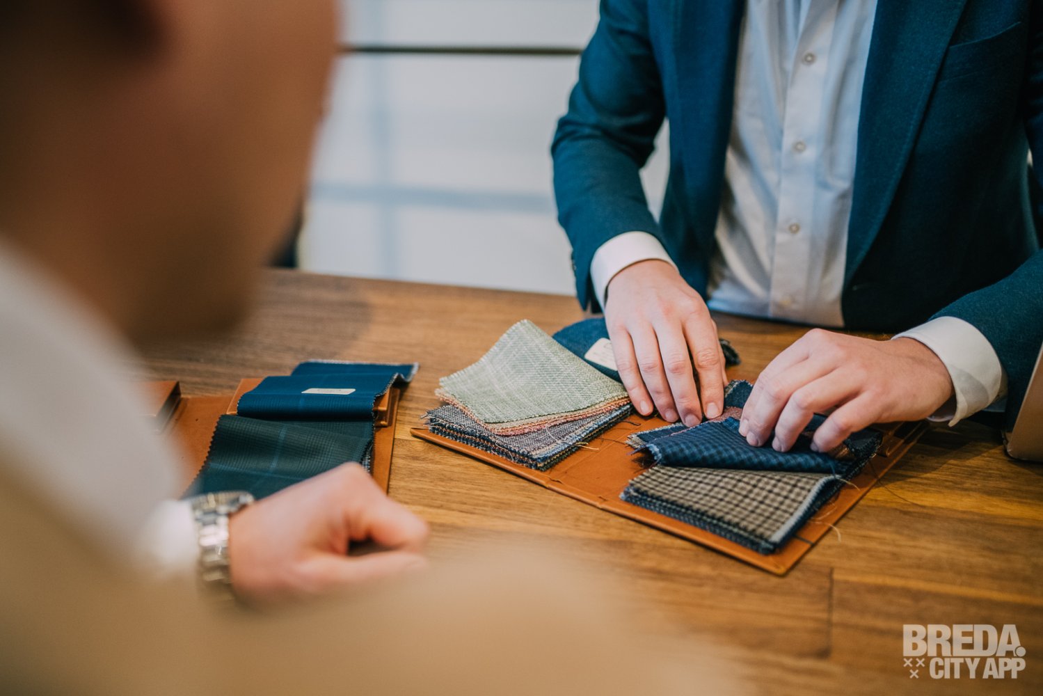 Bij binnenkort worden we allereerst vriendenlijk ontvangen met een kopje koffie, waarna we plaatsnemen aan de bar om stoffen te bekijken. Kleuren, patronen, texturen en verschillende materialen... er is heel veel om uit te kiezen. Gelukkig adviseert Rolf mij goed in dit proces en mag ik verschillende colberts bekijken en passen. Dit helpt enorm bij de visualisatie en de keuze voor o.a. het knoopje, de binnenvoering en ga zo maar door.