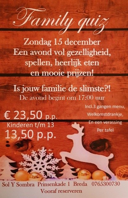 Zondag 15 december organiseert Sol Y Sombra een avond vol gezelligheid, spellen, heerlijk eten en mooie prijzen! Bij dit Spaanse restaurant ben je aan het juiste adres voor de authentieke Spaanse gerechten. Lees snel verder als je hiervan houdt én blok 15 december natuurlijk in je agenda!