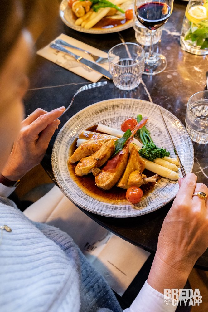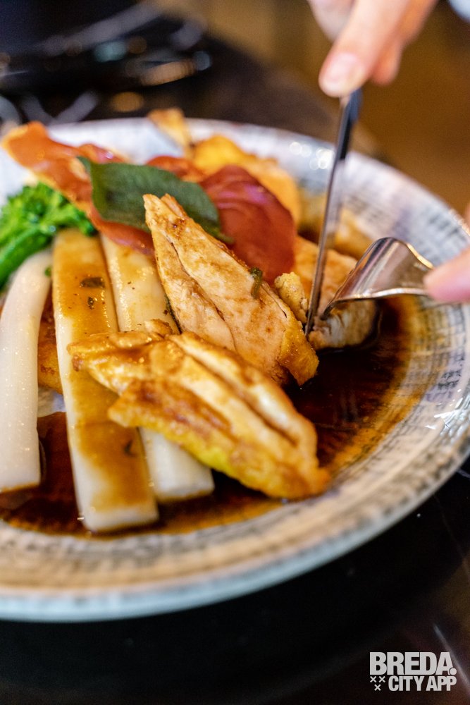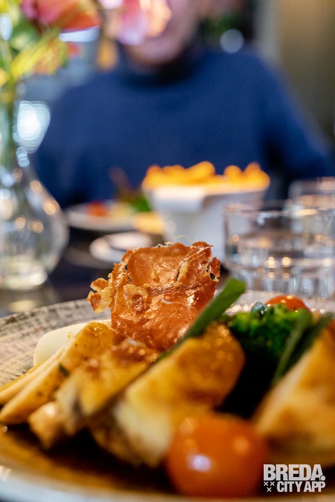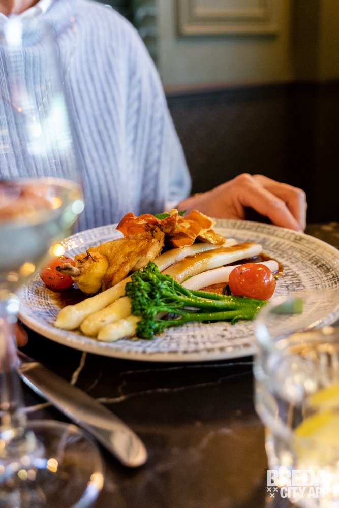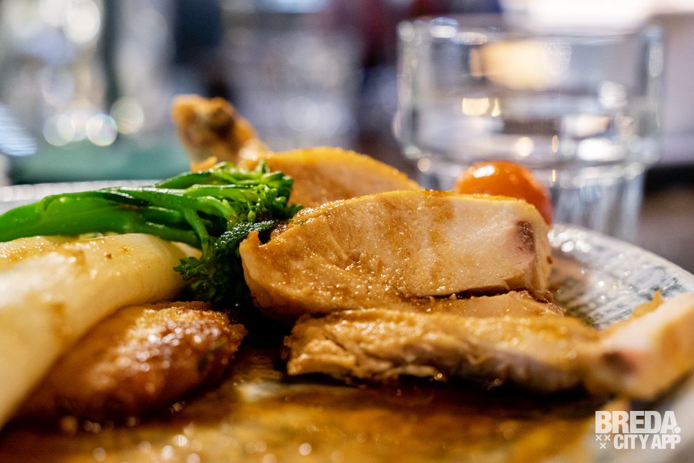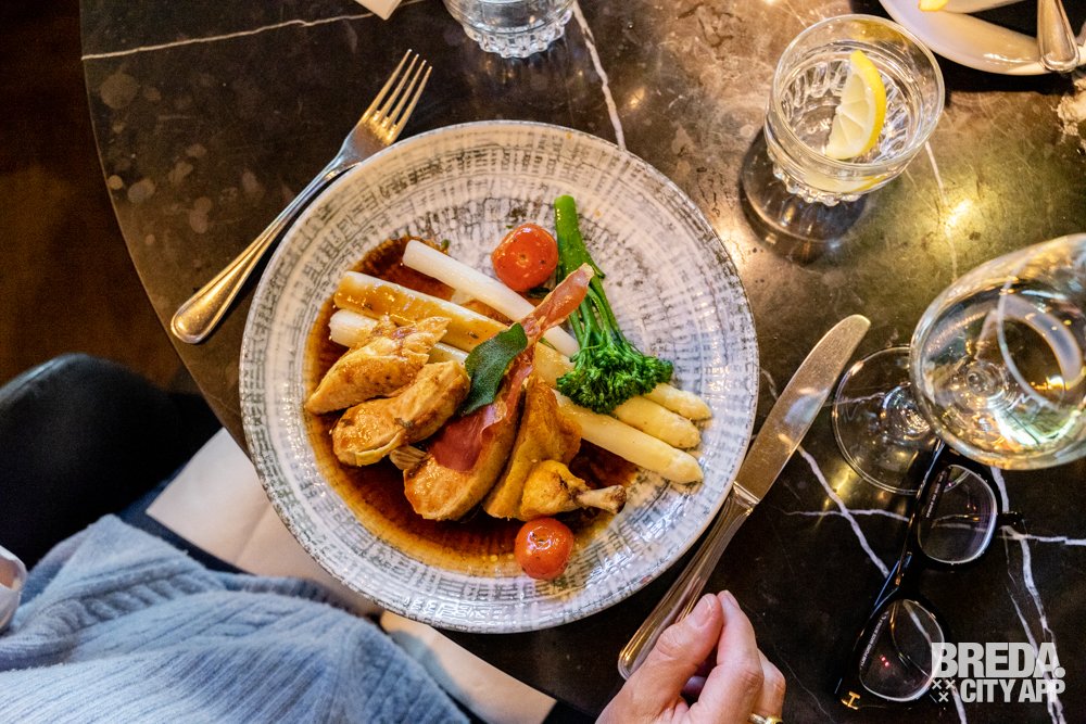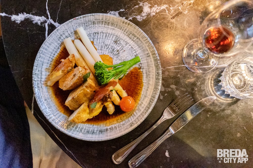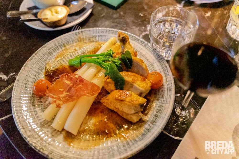 De tweede gang is namelijk parelhoender met twee grote asperges, een krokantje van parmaham, een stukje bimi en een jus van salie. Dit alles wordt mooi gepresenteerd en er wordt een heerlijke portie friet bij geserveerd (deze wil je oprecht niet missen).
